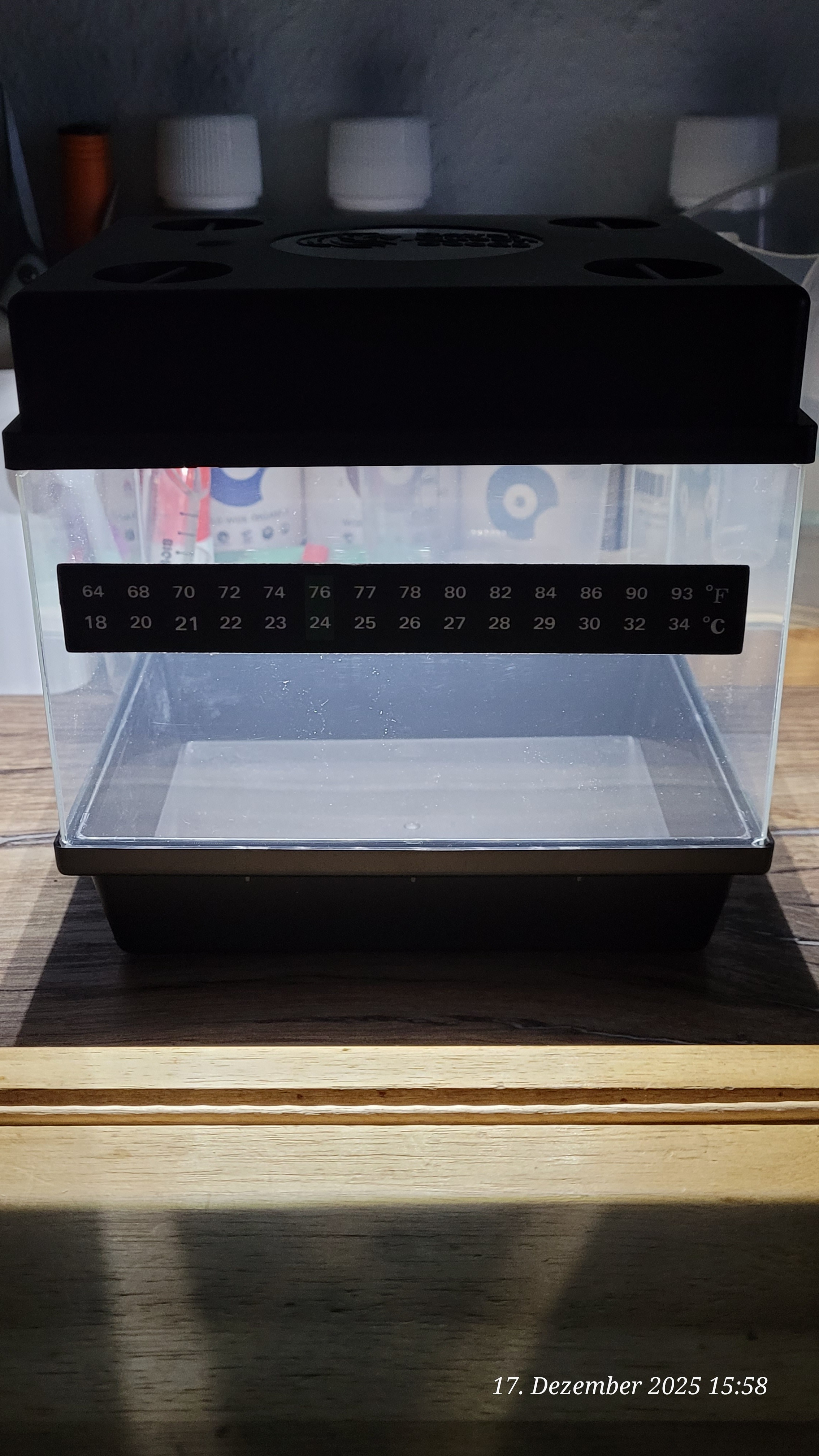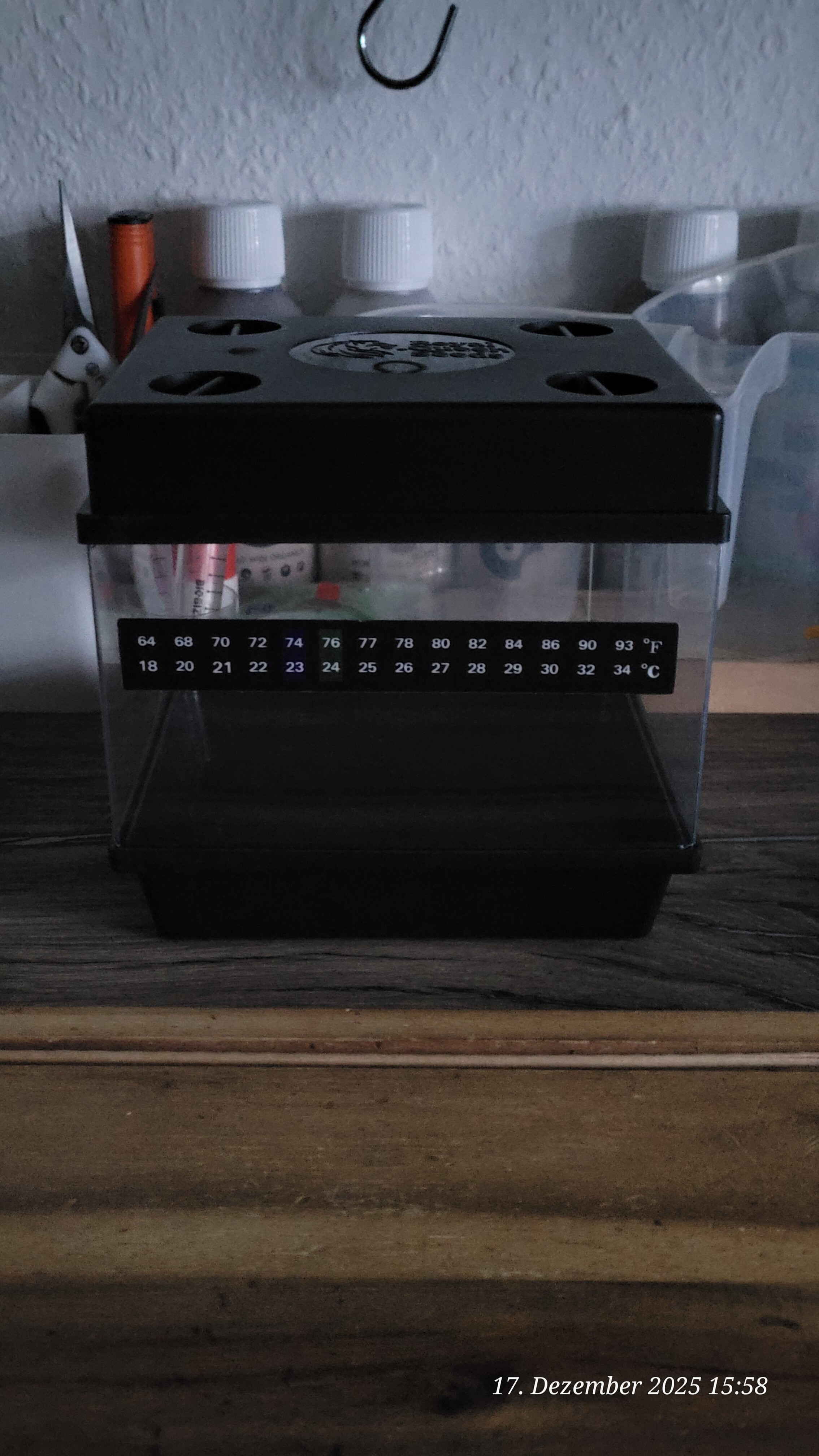 The humidity was already lowered to 71-73% yesterday, tomorrow to 70%, and slowly continuing to fall. The light dimmers were turned up to 25% today, and I aim to reach 30% this week.