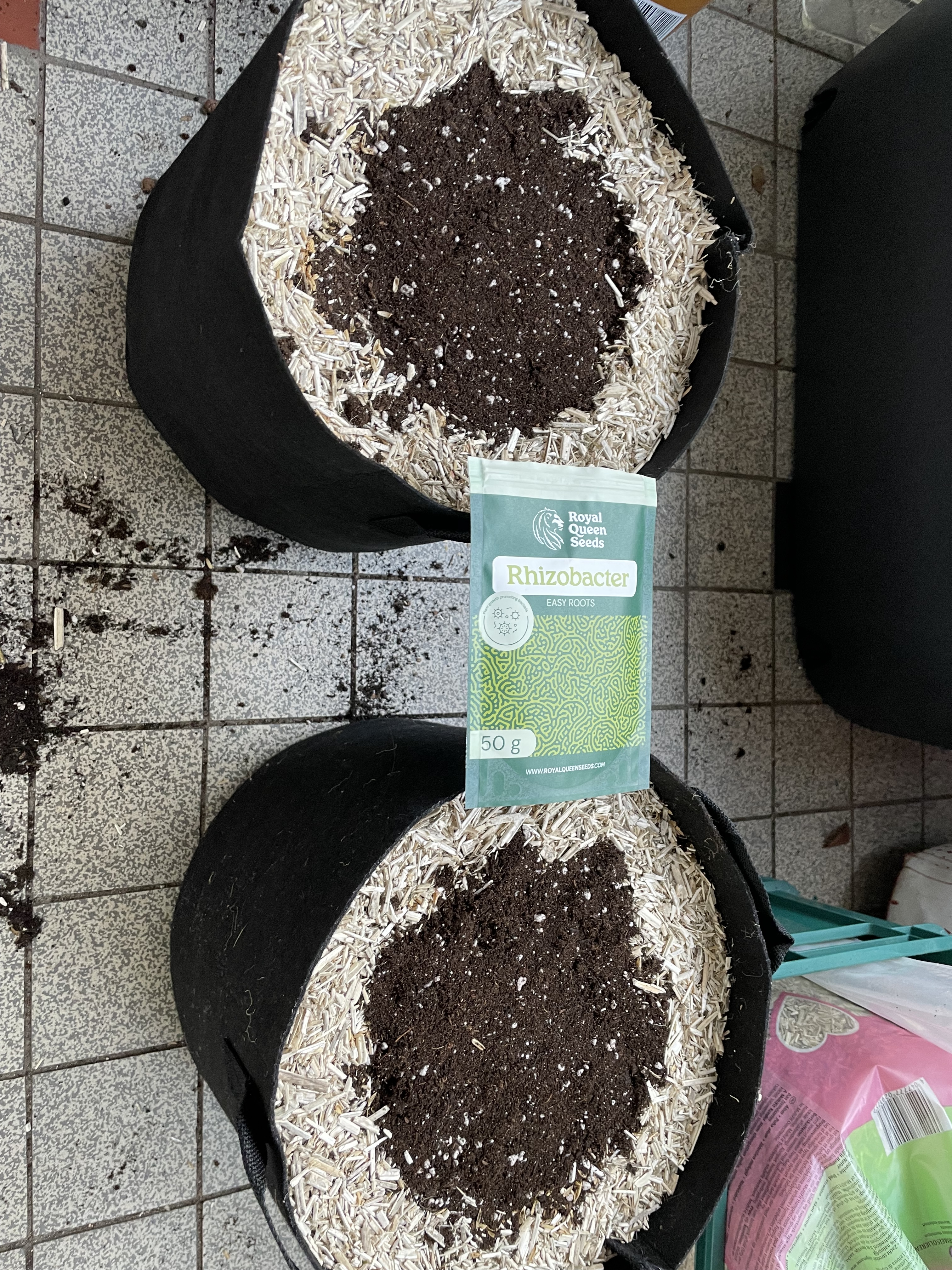 The fabric pots are big, and they can hold a lot of soil. Just too big for the Auto Pot, so tomorrow I have to go buy 4 square saucers measuring 33 - 35 cm so the pots can stand nicely in them. I still have half a bag of expanded clay for good drainage at the bottom. It will need to be washed soon.