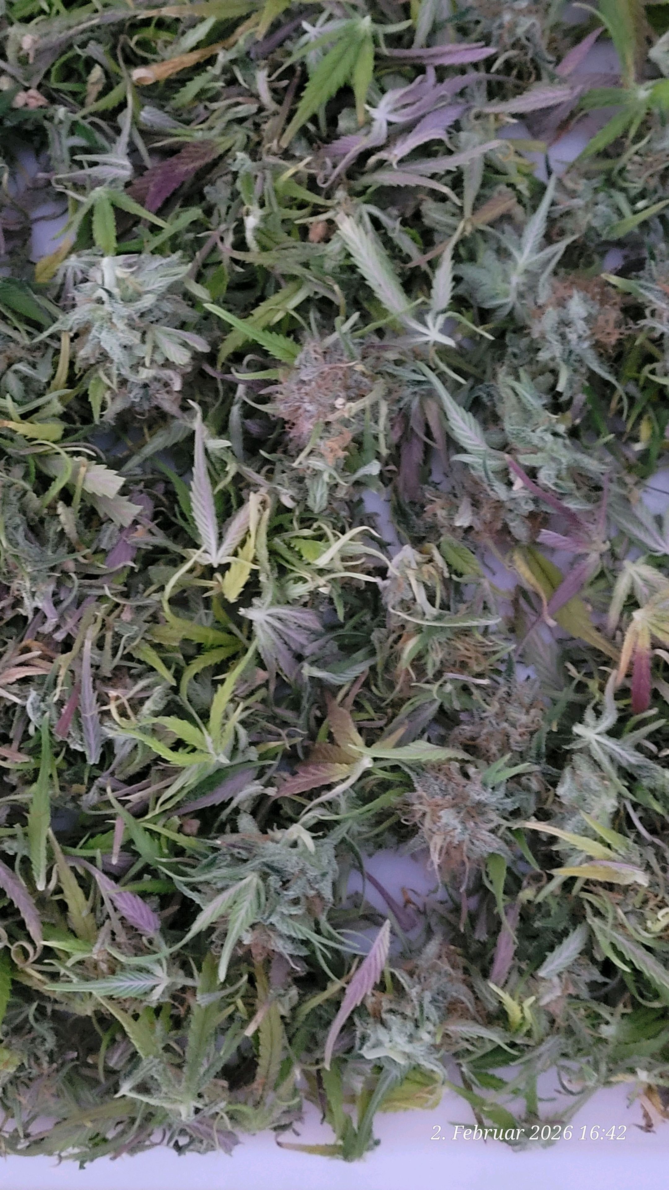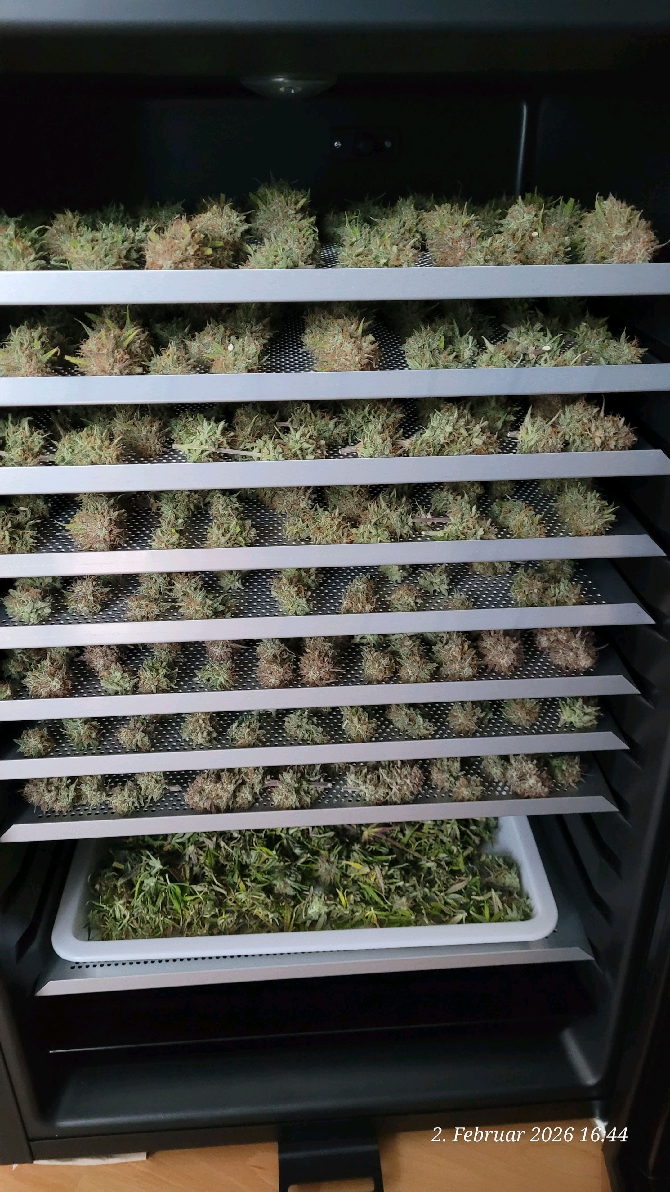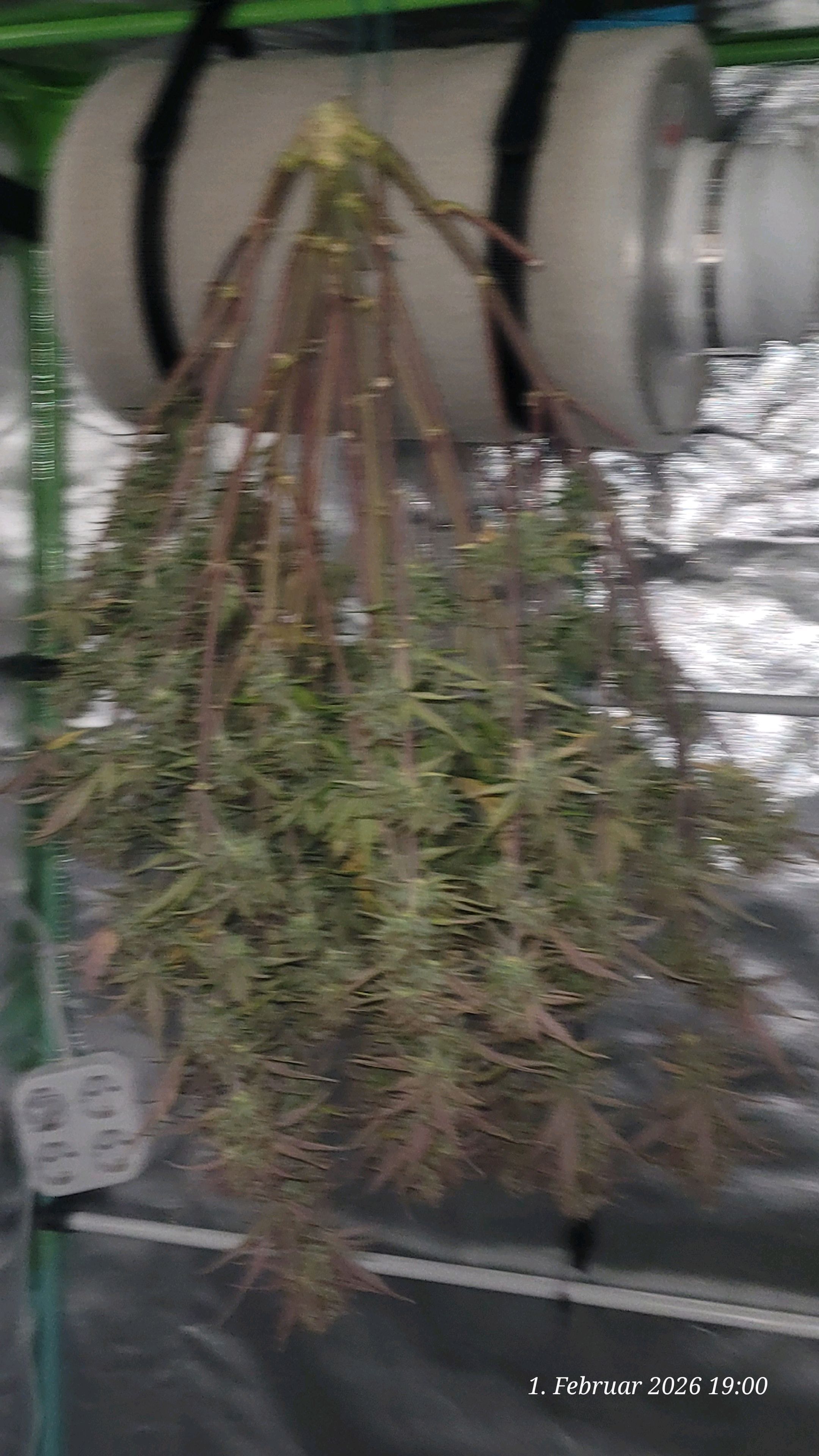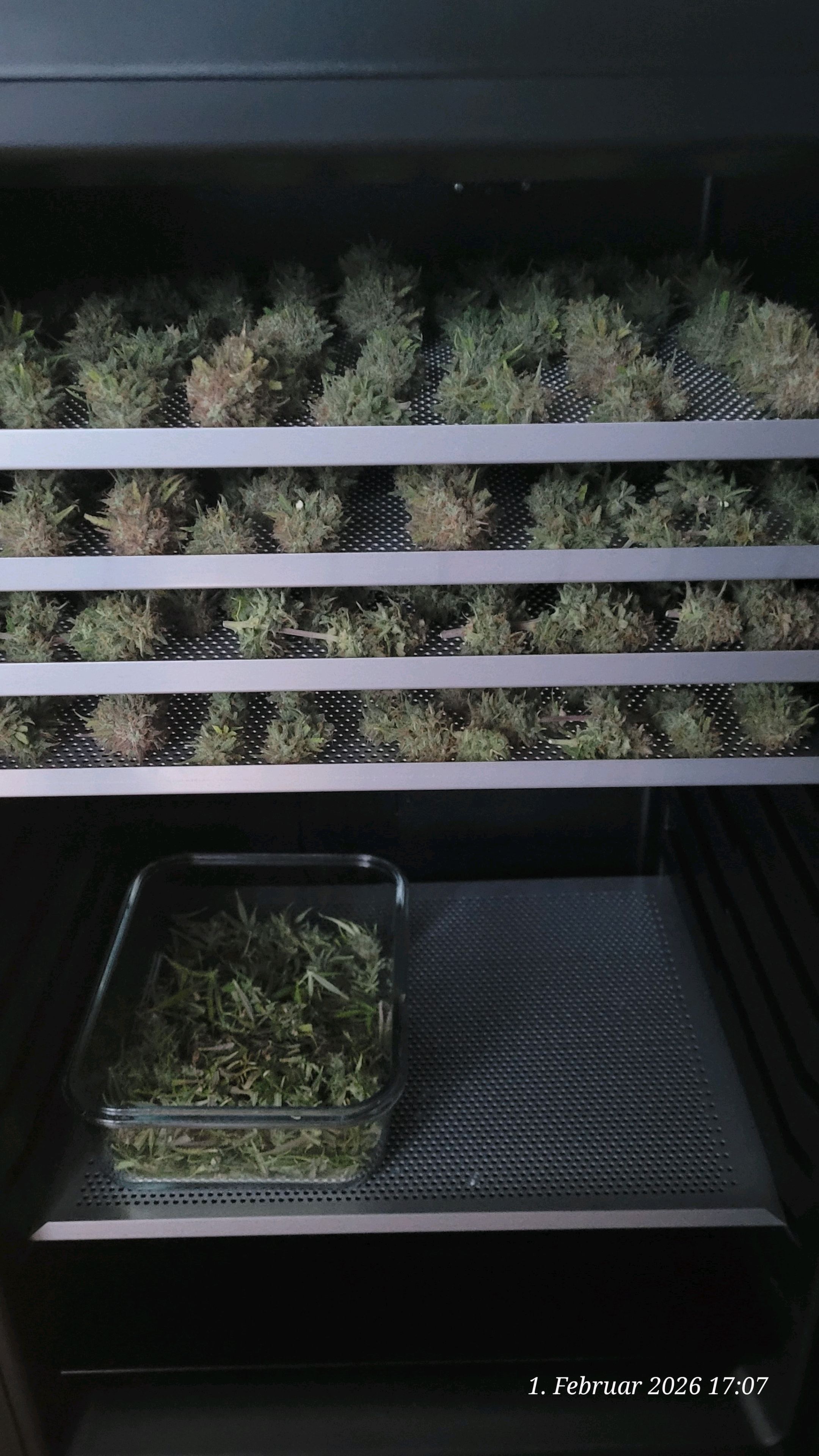 One layer of her is in the Cannatrol. De-stemmed and wet-trimmed, that’s already 107 gr. wet buds. The rest hangs whole, upside down in the dark tent. The lamp has already been removed for cleaning and disinfection. Only the smallest fan on the floor and the exhaust on 1 are running until tomorrow, and then more de-stemming and wet-trimming will continue.