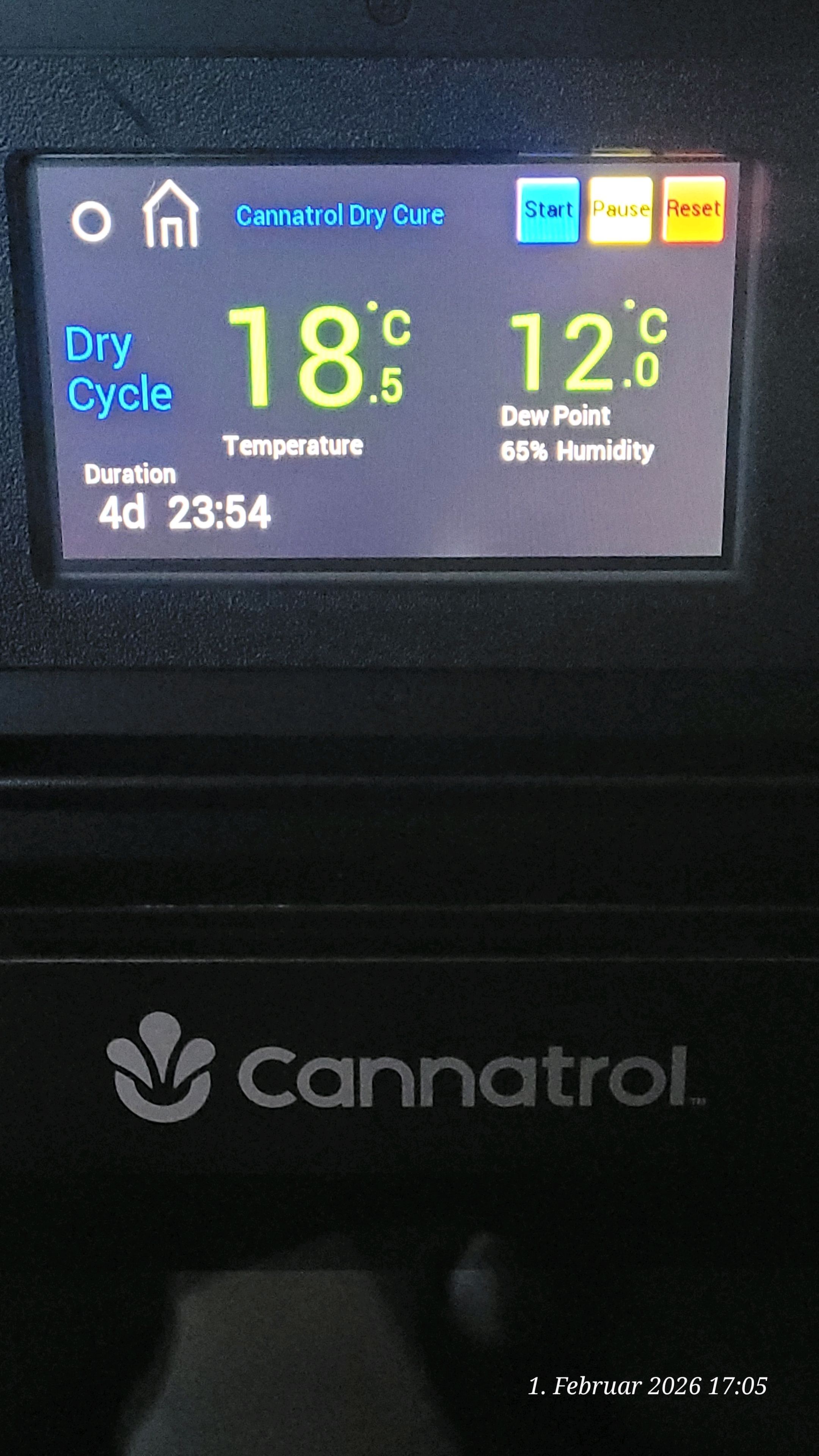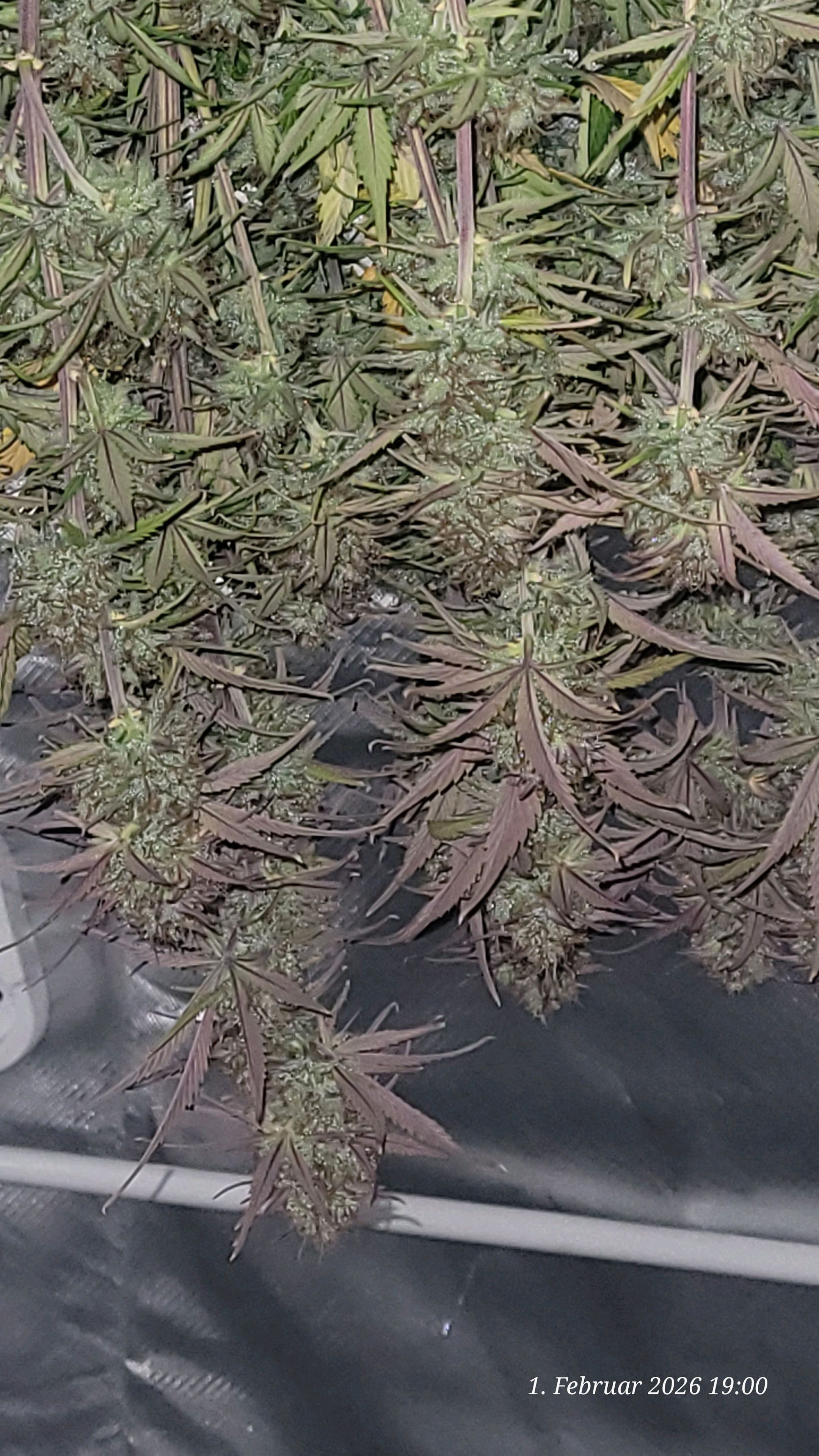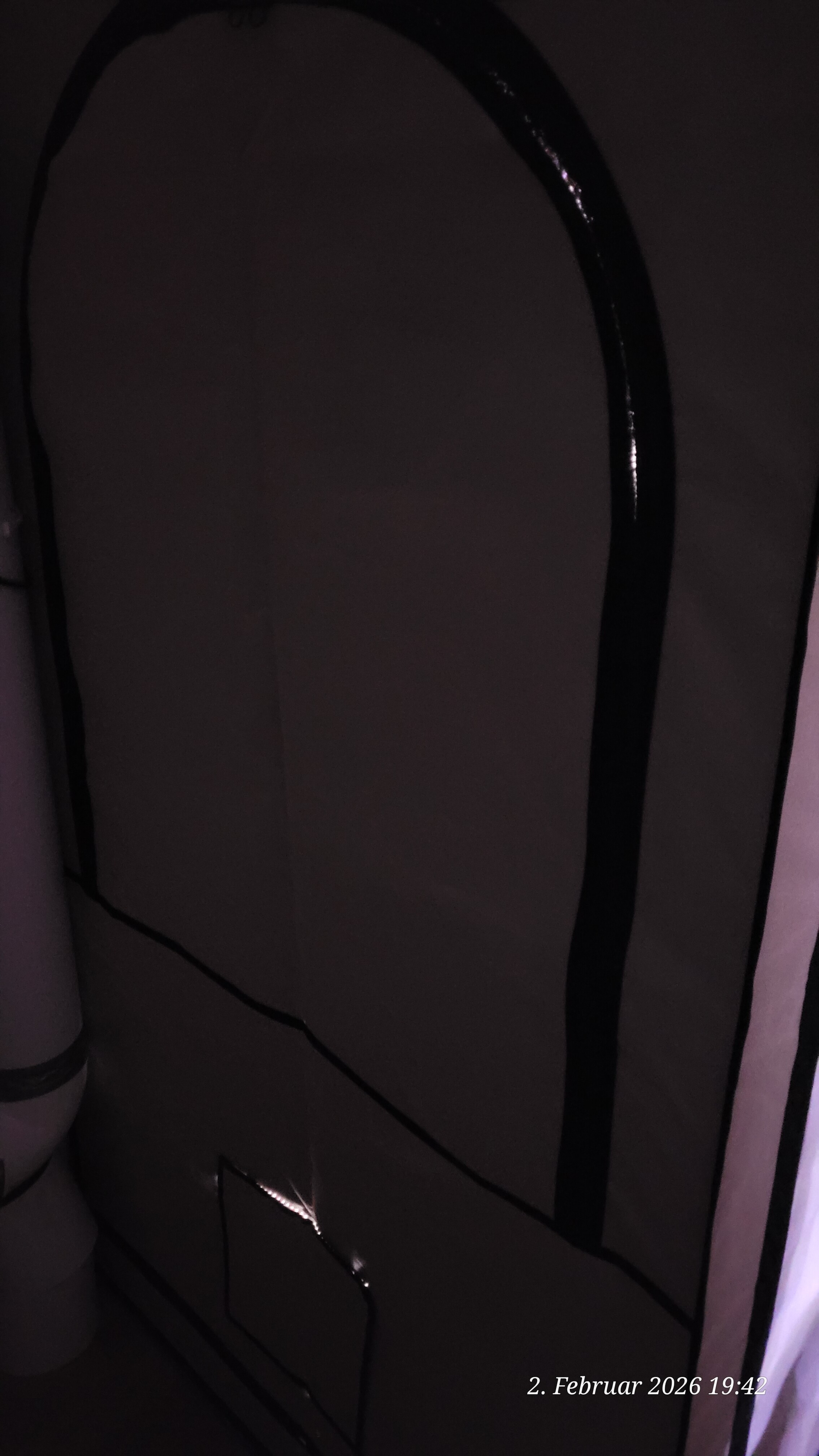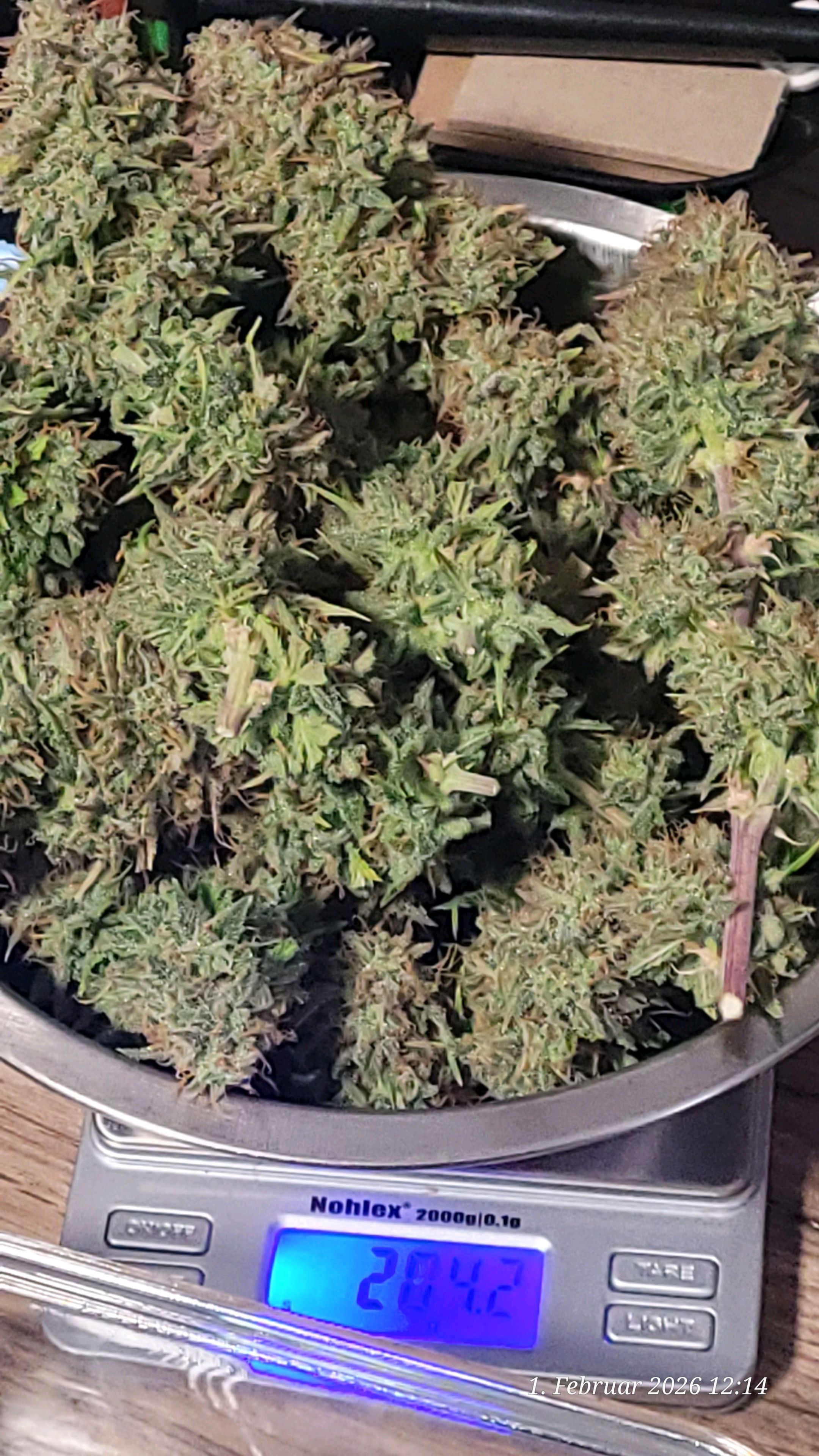 One layer of her is in the Cannatrol. De-stemmed and wet-trimmed, that’s already 107 gr. wet buds. The rest hangs whole, upside down in the dark tent. The lamp has already been removed for cleaning and disinfection. Only the smallest fan on the floor and the exhaust on 1 are running until tomorrow, and then more de-stemming and wet-trimming will continue.