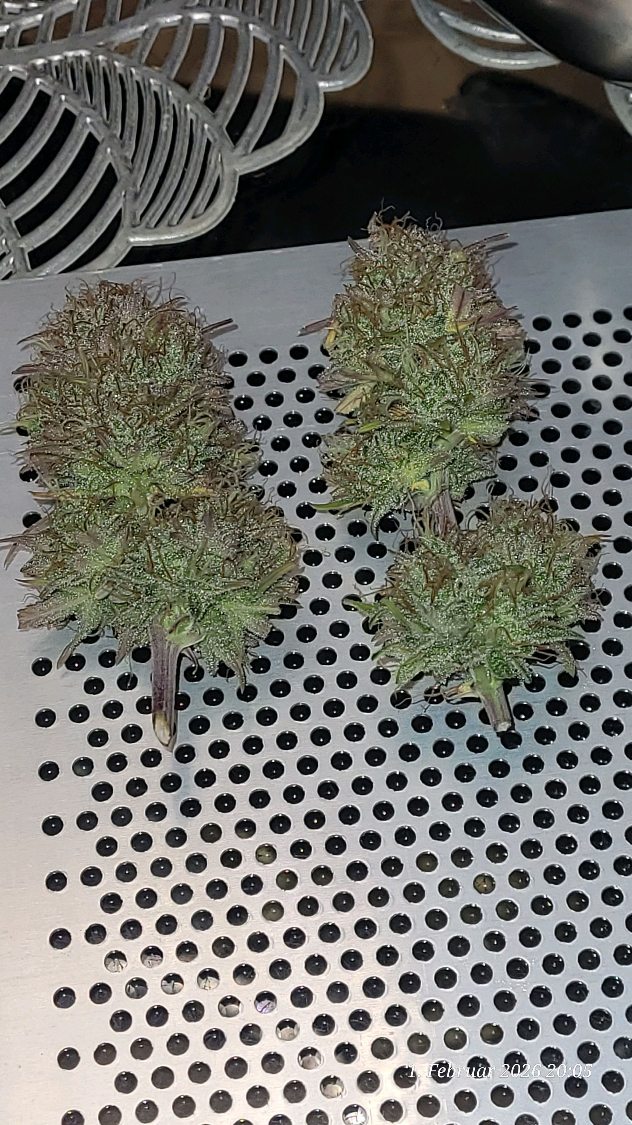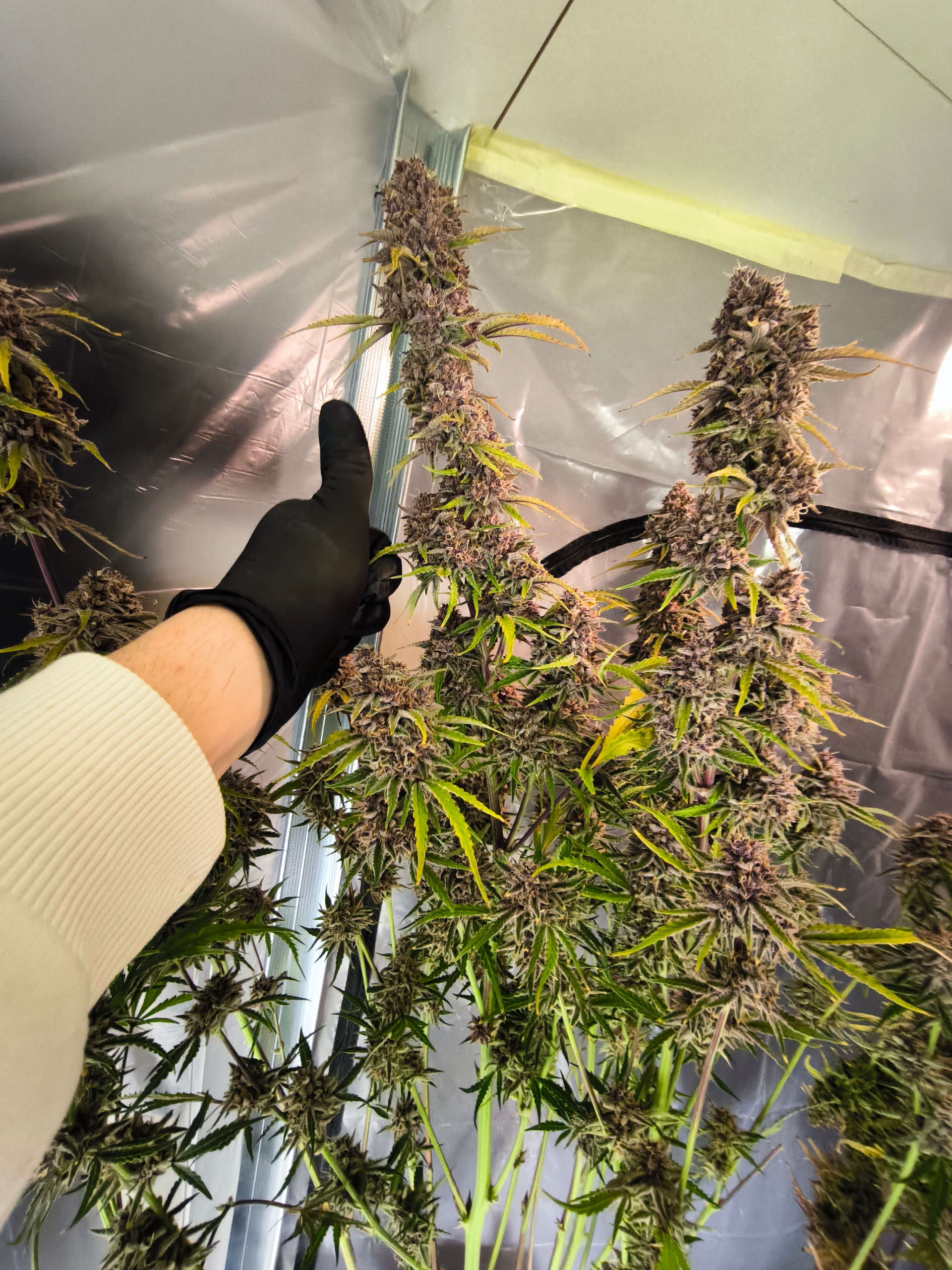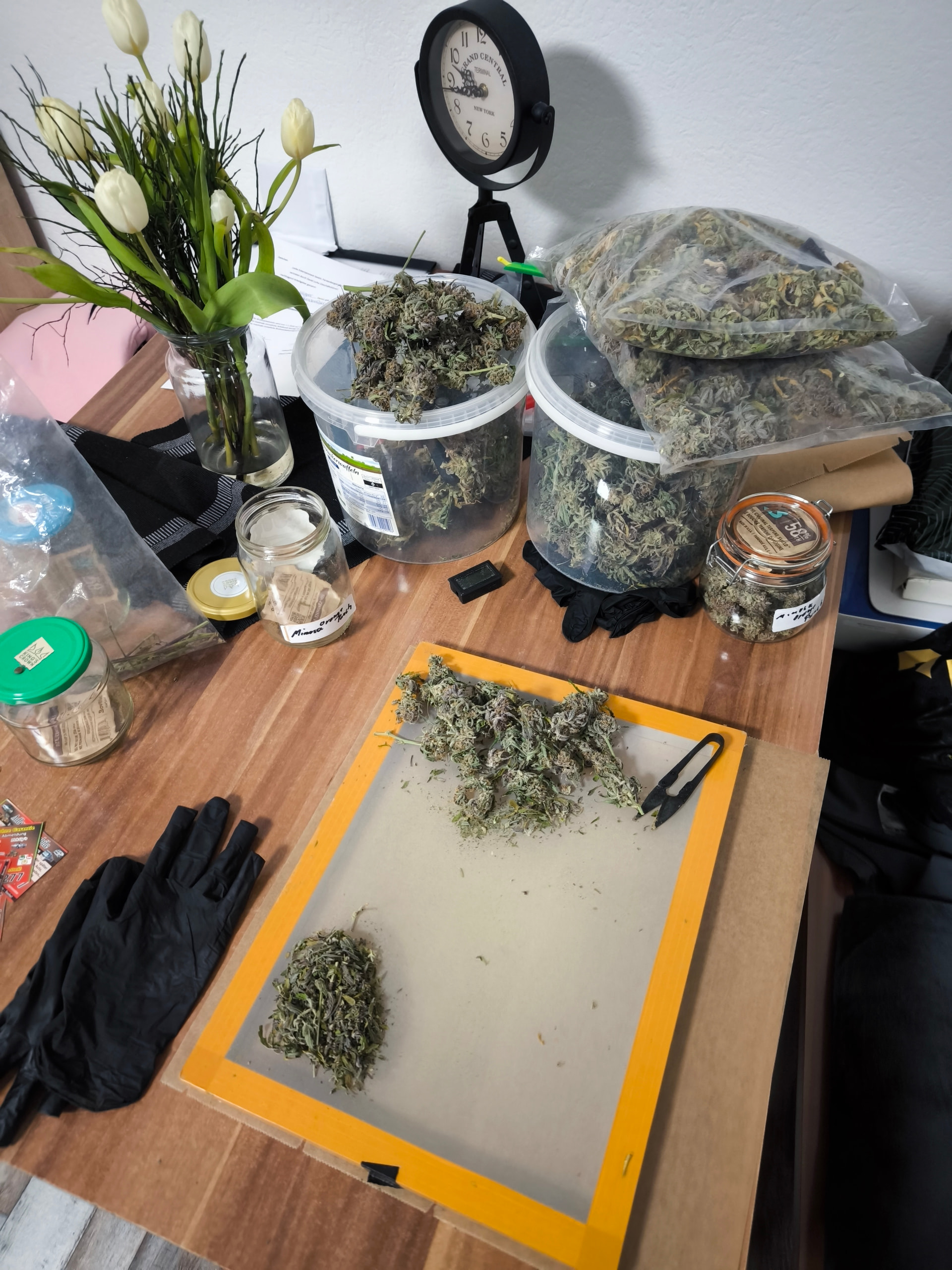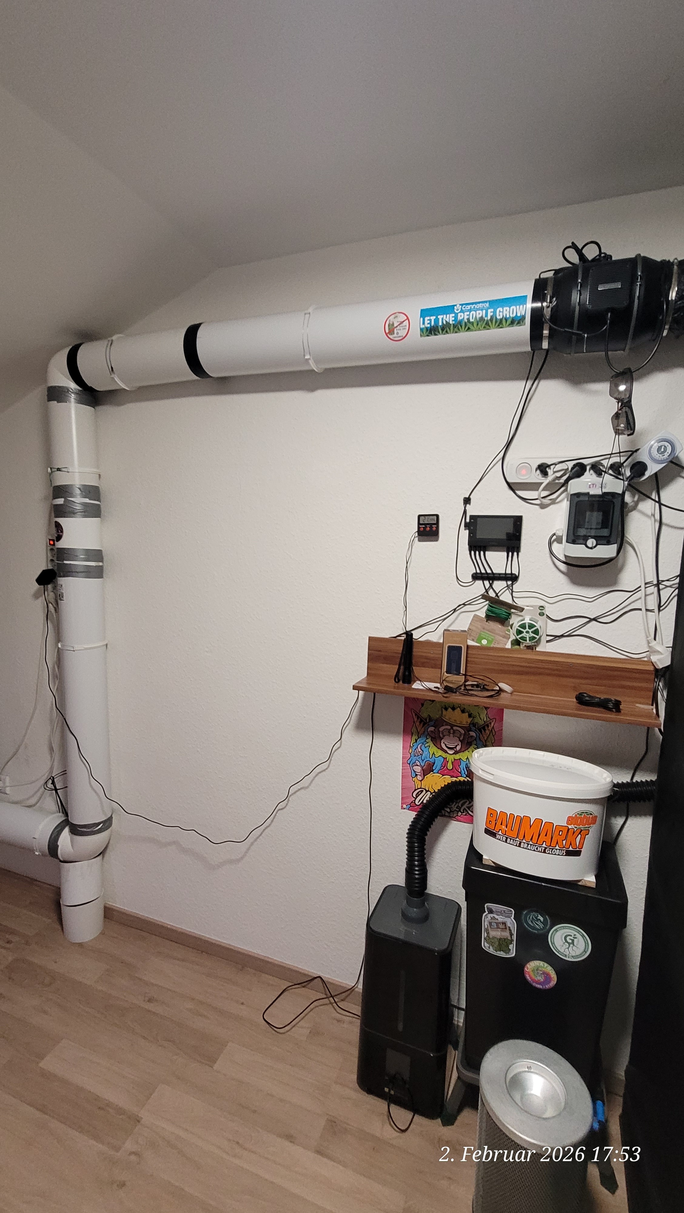 One layer of her is in the Cannatrol. De-stemmed and wet-trimmed, that’s already 107 gr. wet buds. The rest hangs whole, upside down in the dark tent. The lamp has already been removed for cleaning and disinfection. Only the smallest fan on the floor and the exhaust on 1 are running until tomorrow, and then more de-stemming and wet-trimming will continue.