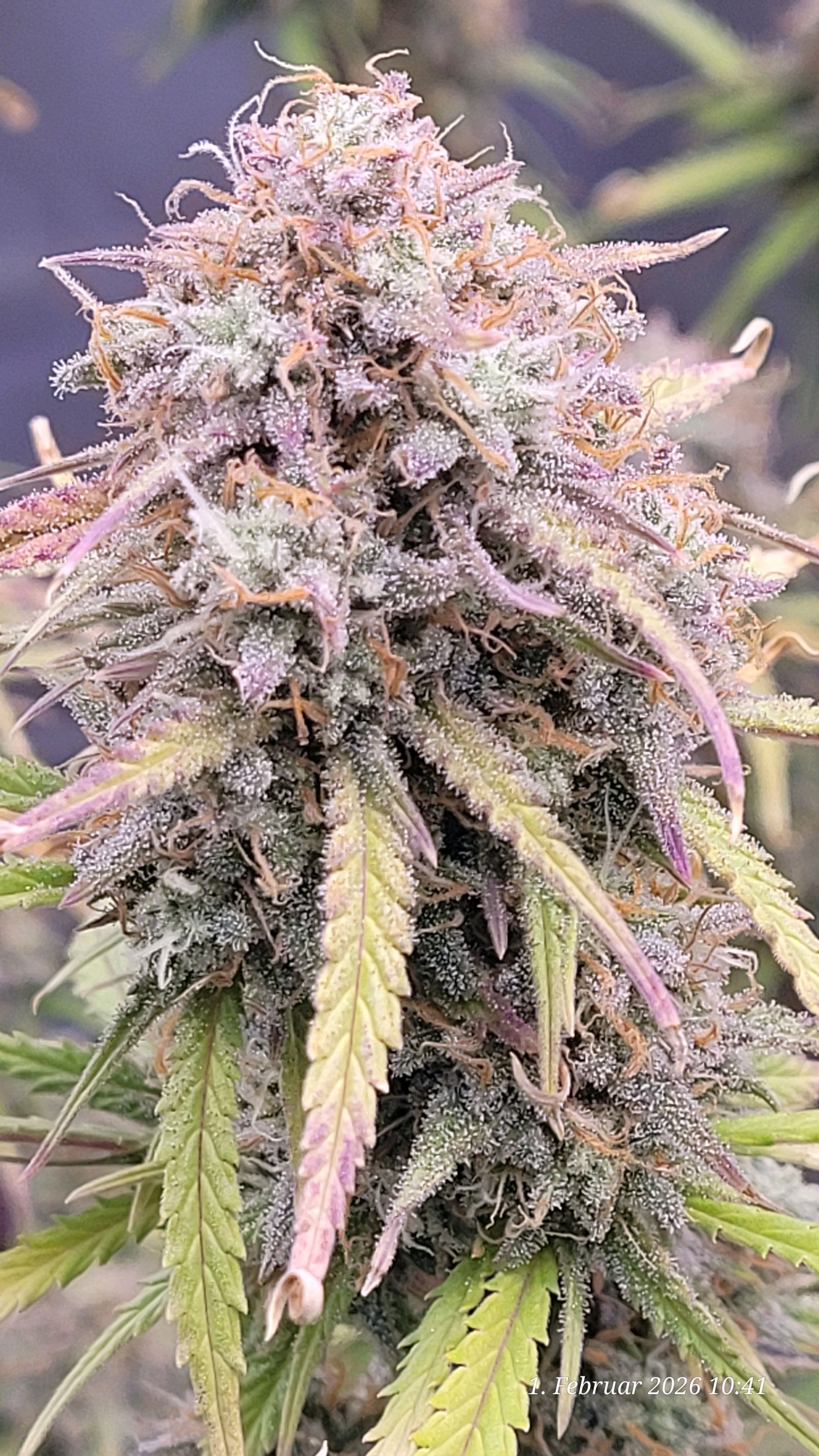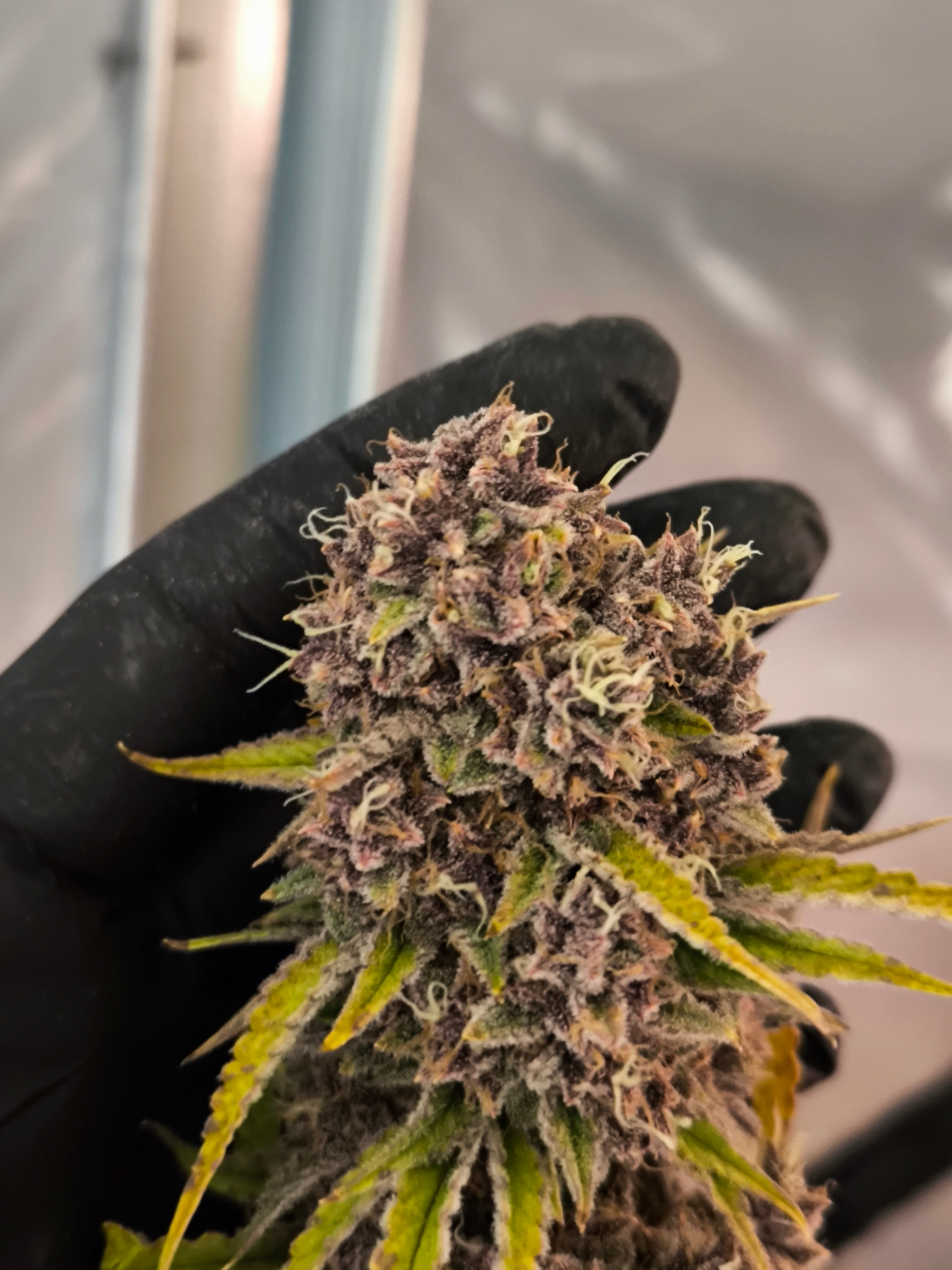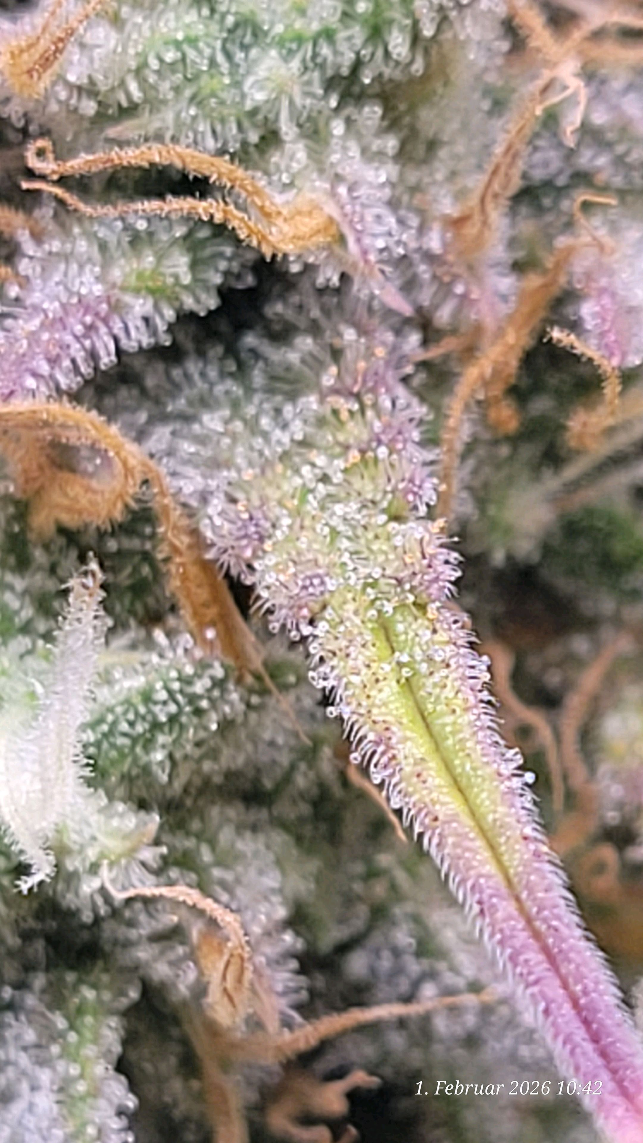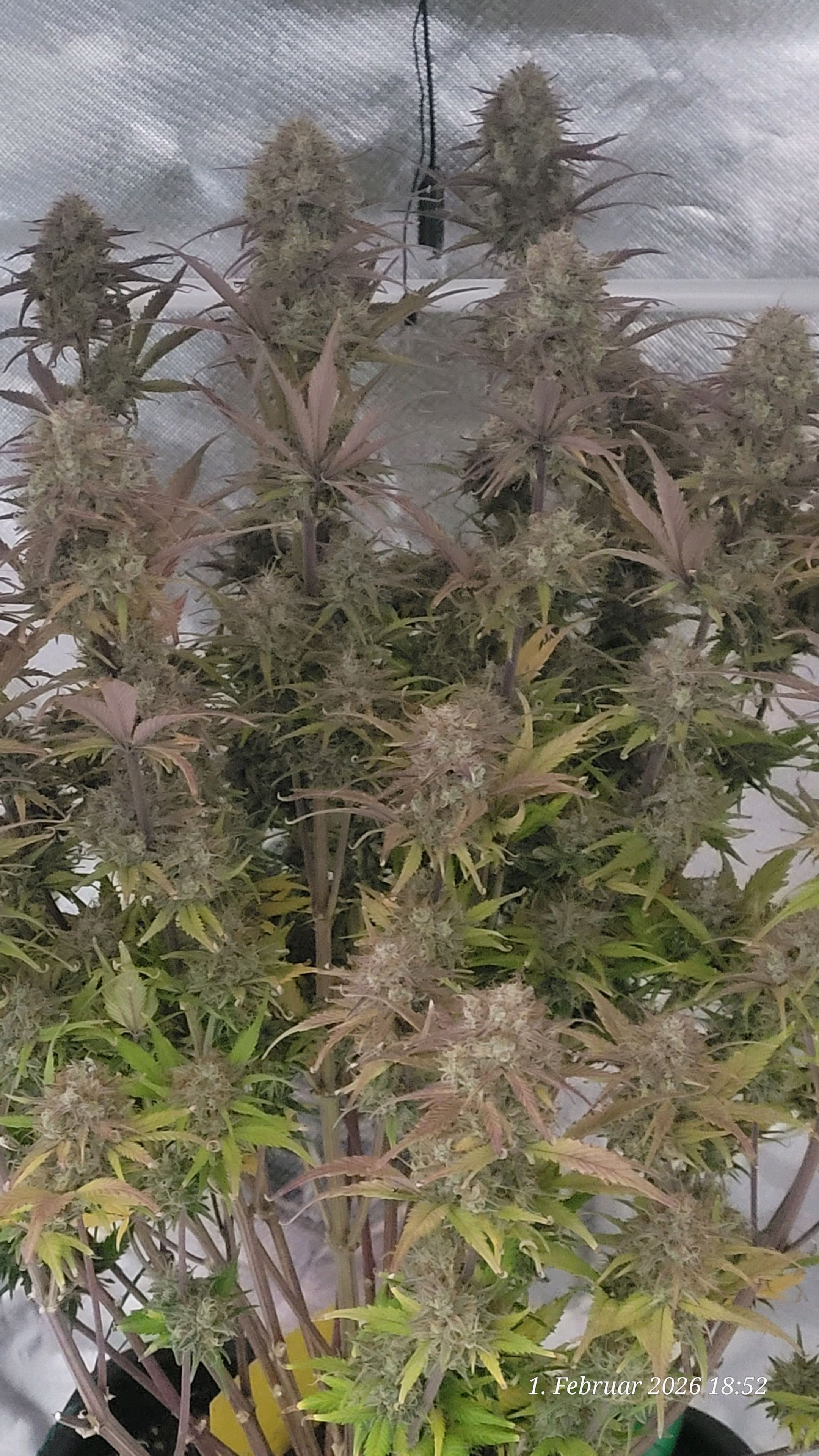 One layer of her is in the Cannatrol. De-stemmed and wet-trimmed, that’s already 107 gr. wet buds. The rest hangs whole, upside down in the dark tent. The lamp has already been removed for cleaning and disinfection. Only the smallest fan on the floor and the exhaust on 1 are running until tomorrow, and then more de-stemming and wet-trimming will continue.