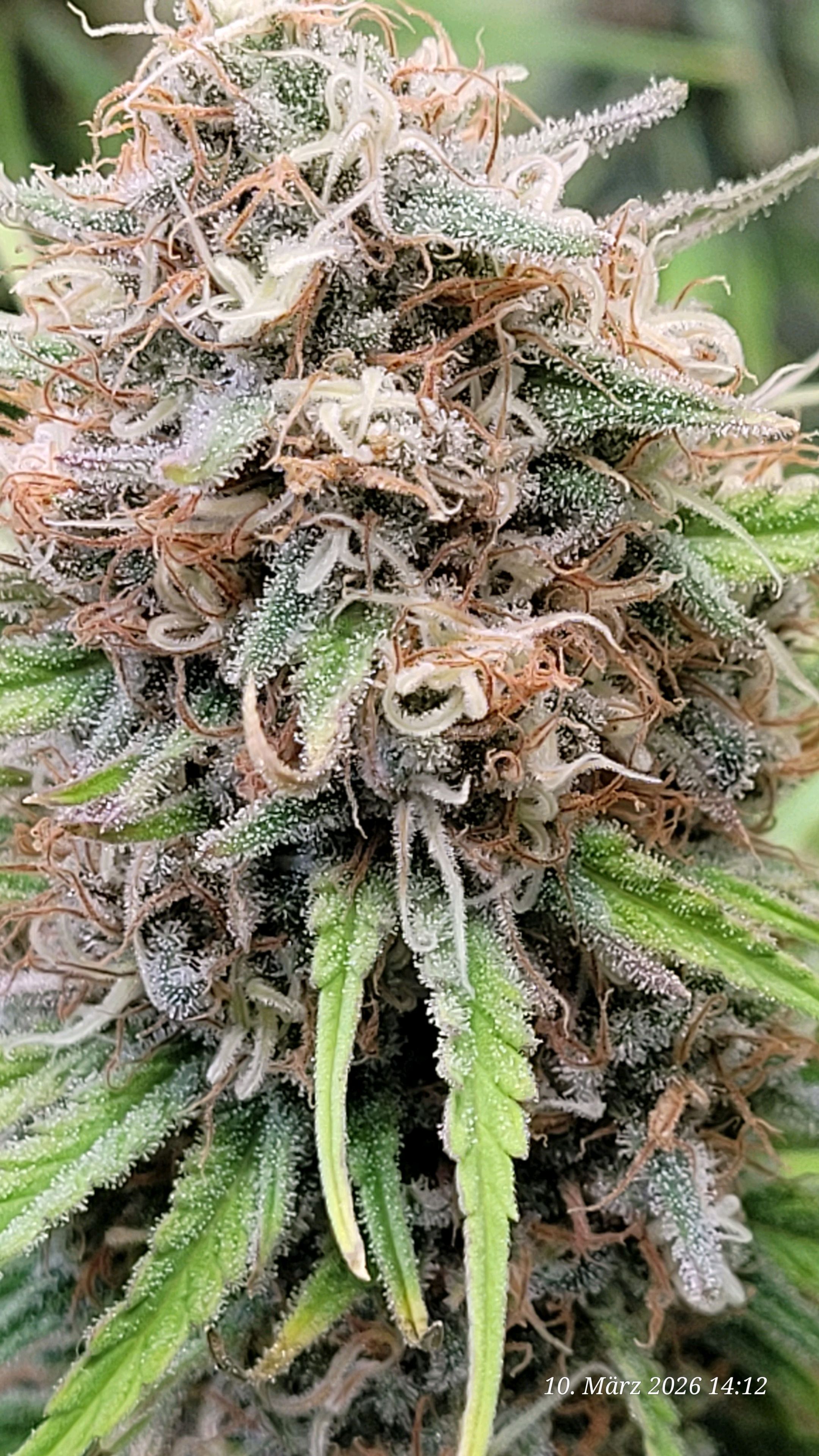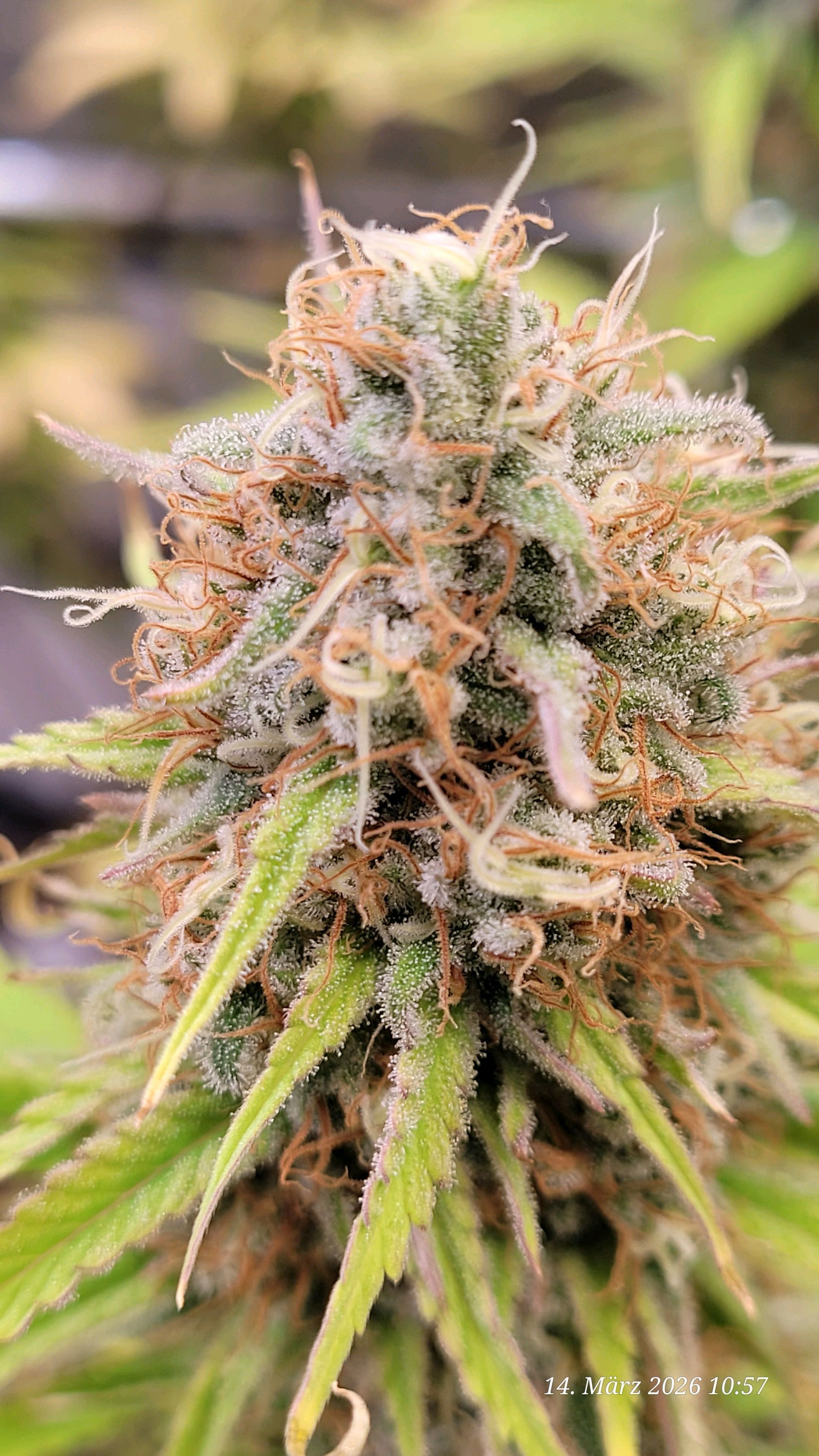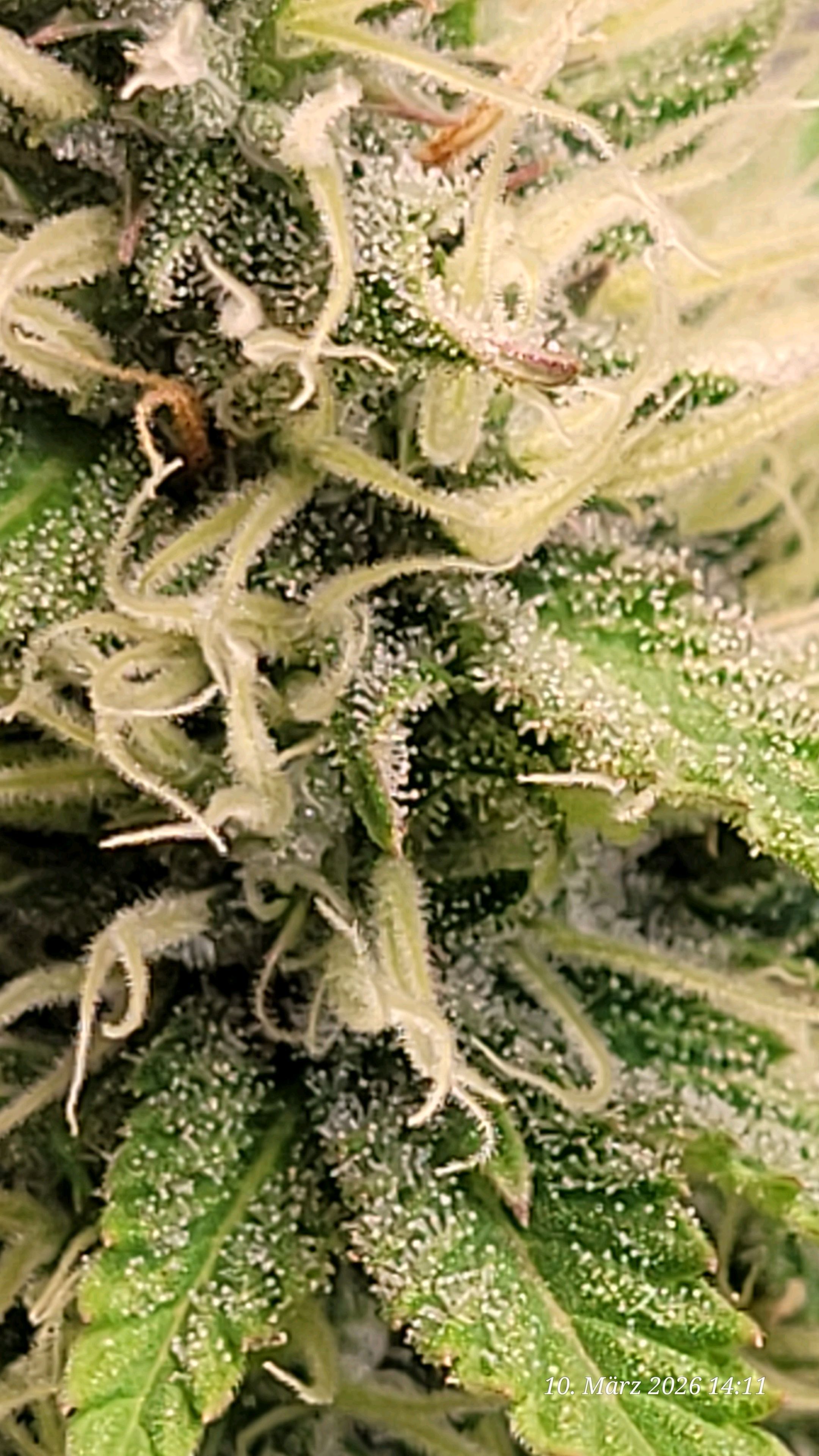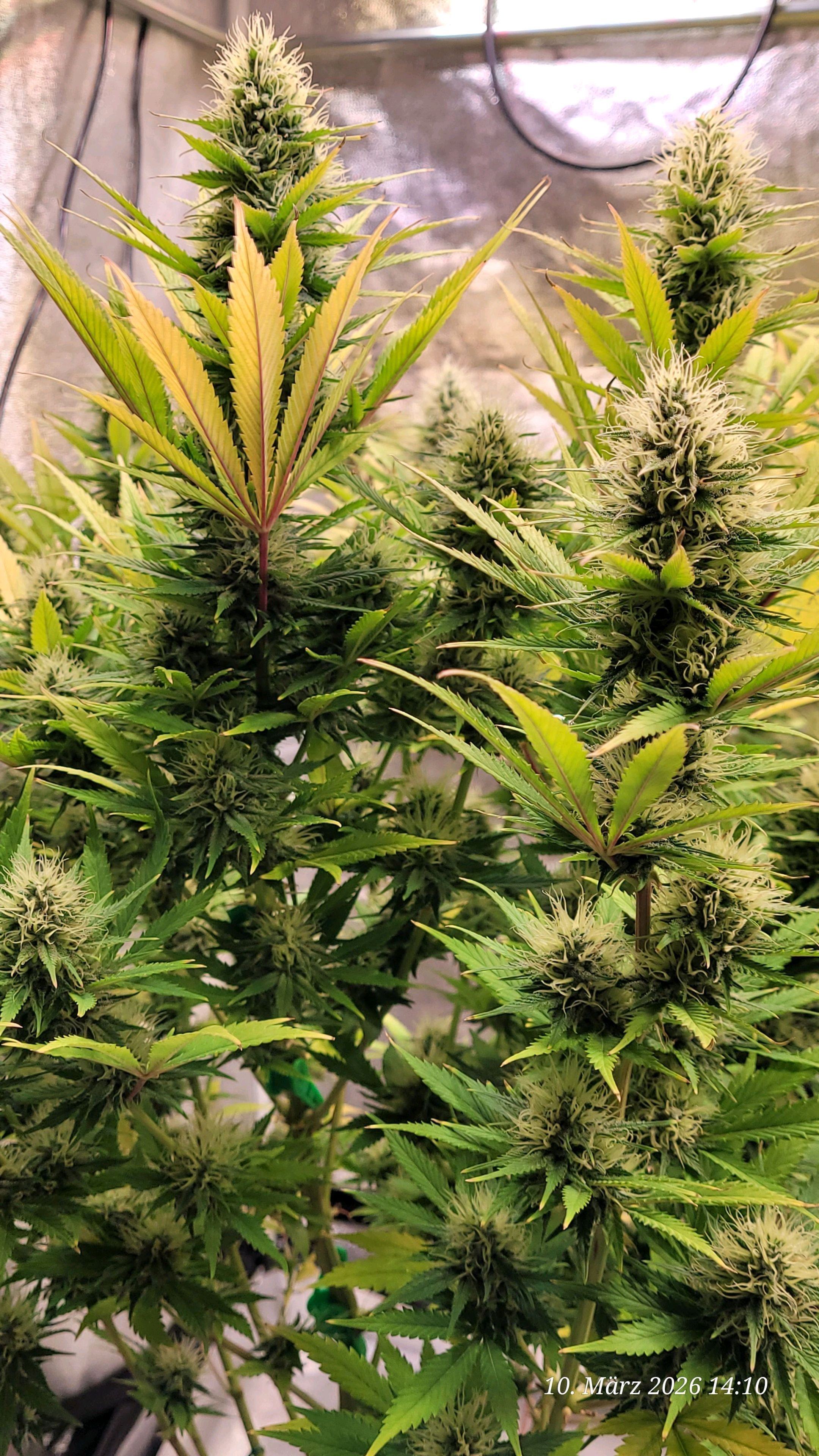 These will once again be very dense, firm buds and guaranteed with a well-rounded aroma. In about 20 days, the two will be ready. Given 60 - 65 flowering days, I will reach the end around 63 to 68 days. A few more days that will show what else is coming. The Jamaican needs a few more days. It is also noted as Sativa dominant, but with a relatively short flowering time. But its journey is already going into 9 - 11 flowering weeks. And only now are the first 2 pistils beginning to turn orange/brown on her. All others are still light! Apart from her light stress, which I have now somewhat corrected, and the associated nutrient shift / magnesium deficiency, she is still developing well. The ‘pompoms’ (buds) are continuously increasing in size.