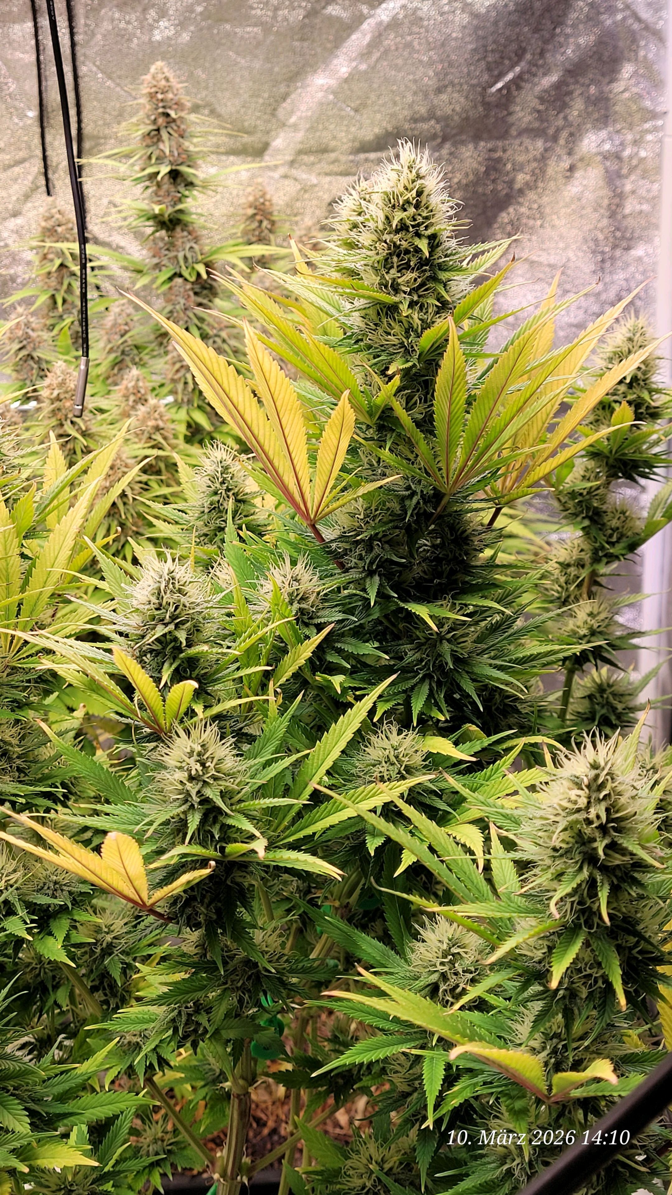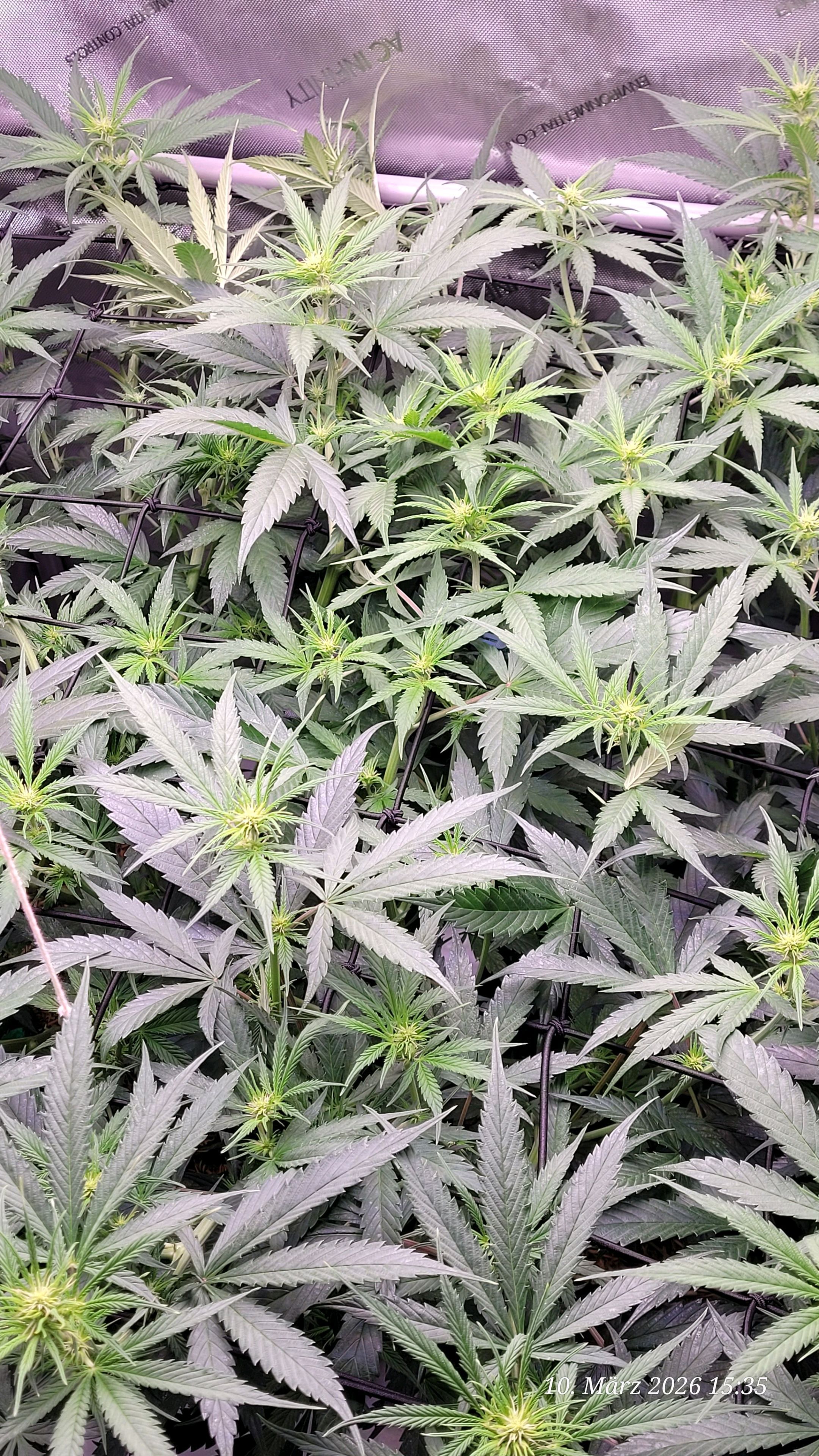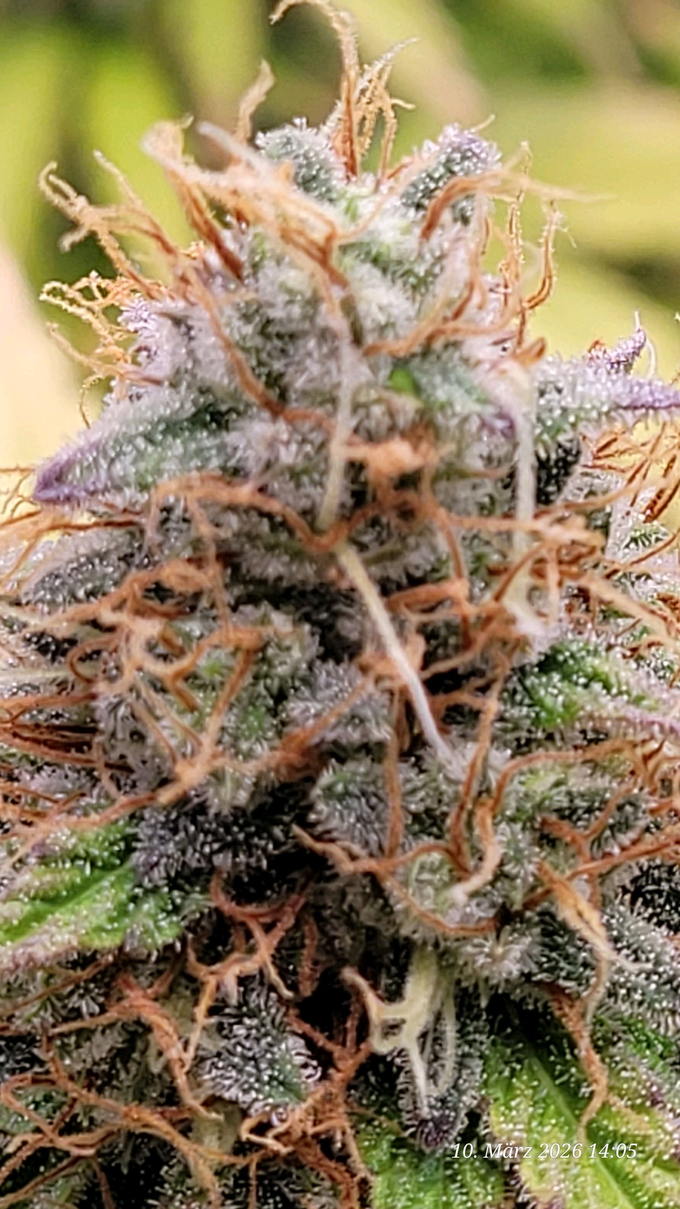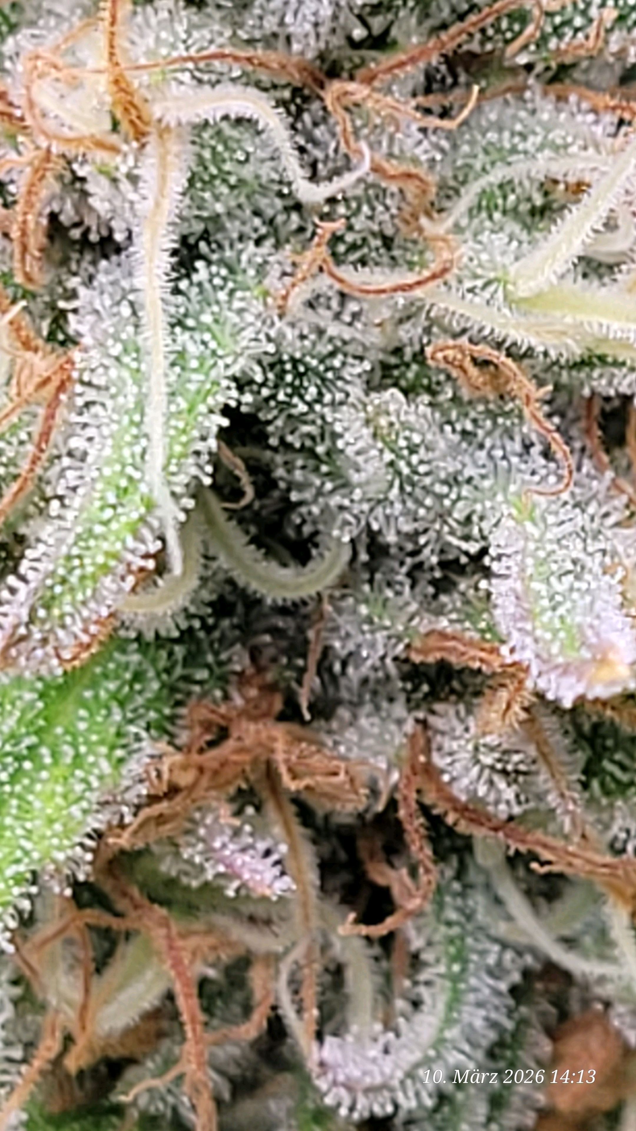These will once again be very dense, firm buds and guaranteed with a well-rounded aroma. In about 20 days, the two will be ready. Given 60 - 65 flowering days, I will reach the end around 63 to 68 days. A few more days that will show what else is coming. The Jamaican needs a few more days. It is also noted as Sativa dominant, but with a relatively short flowering time. But its journey is already going into 9 - 11 flowering weeks. And only now are the first 2 pistils beginning to turn orange/brown on her. All others are still light! Apart from her light stress, which I have now somewhat corrected, and the associated nutrient shift / magnesium deficiency, she is still developing well. The ‘pompoms’ (buds) are continuously increasing in size.
