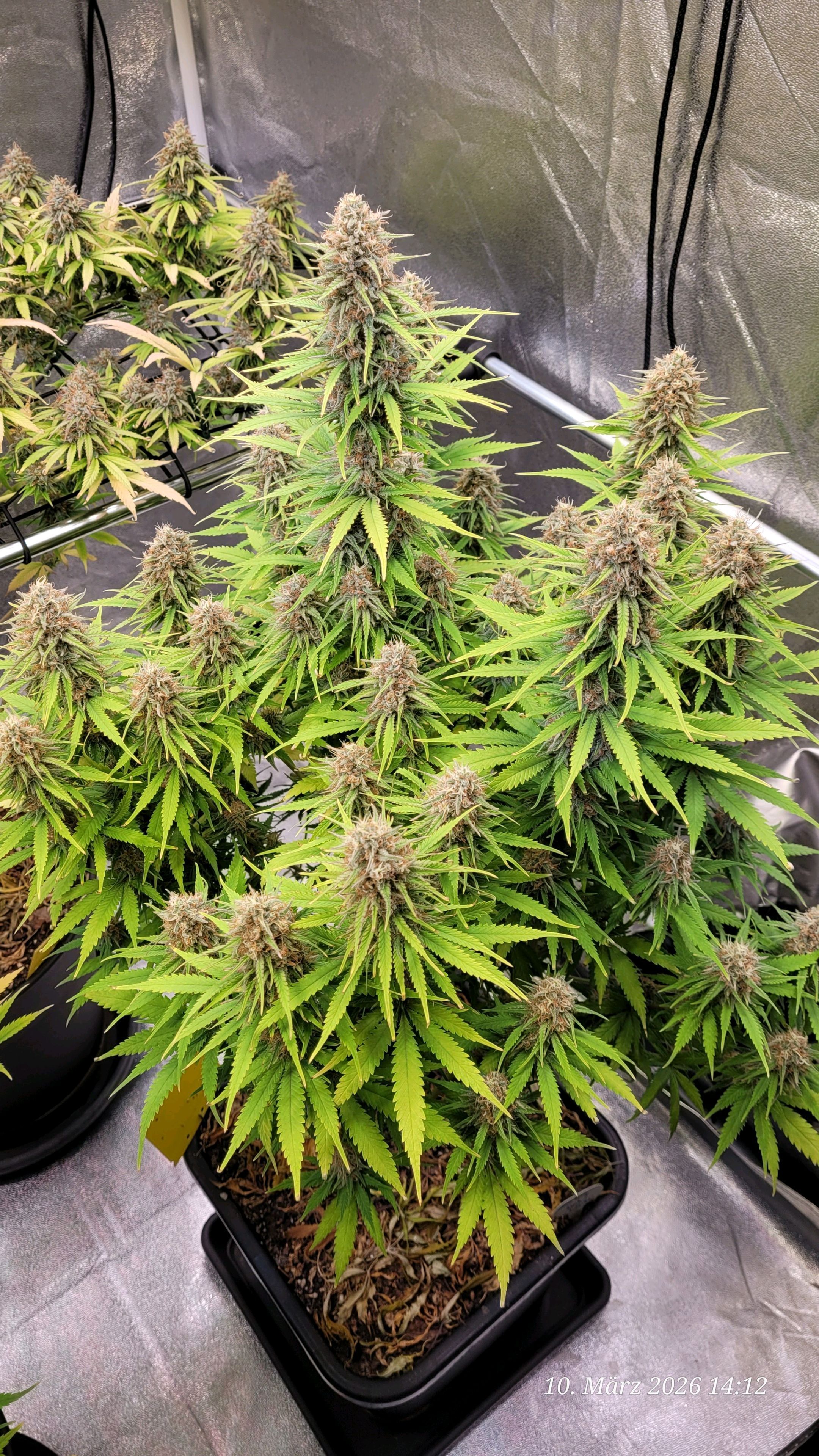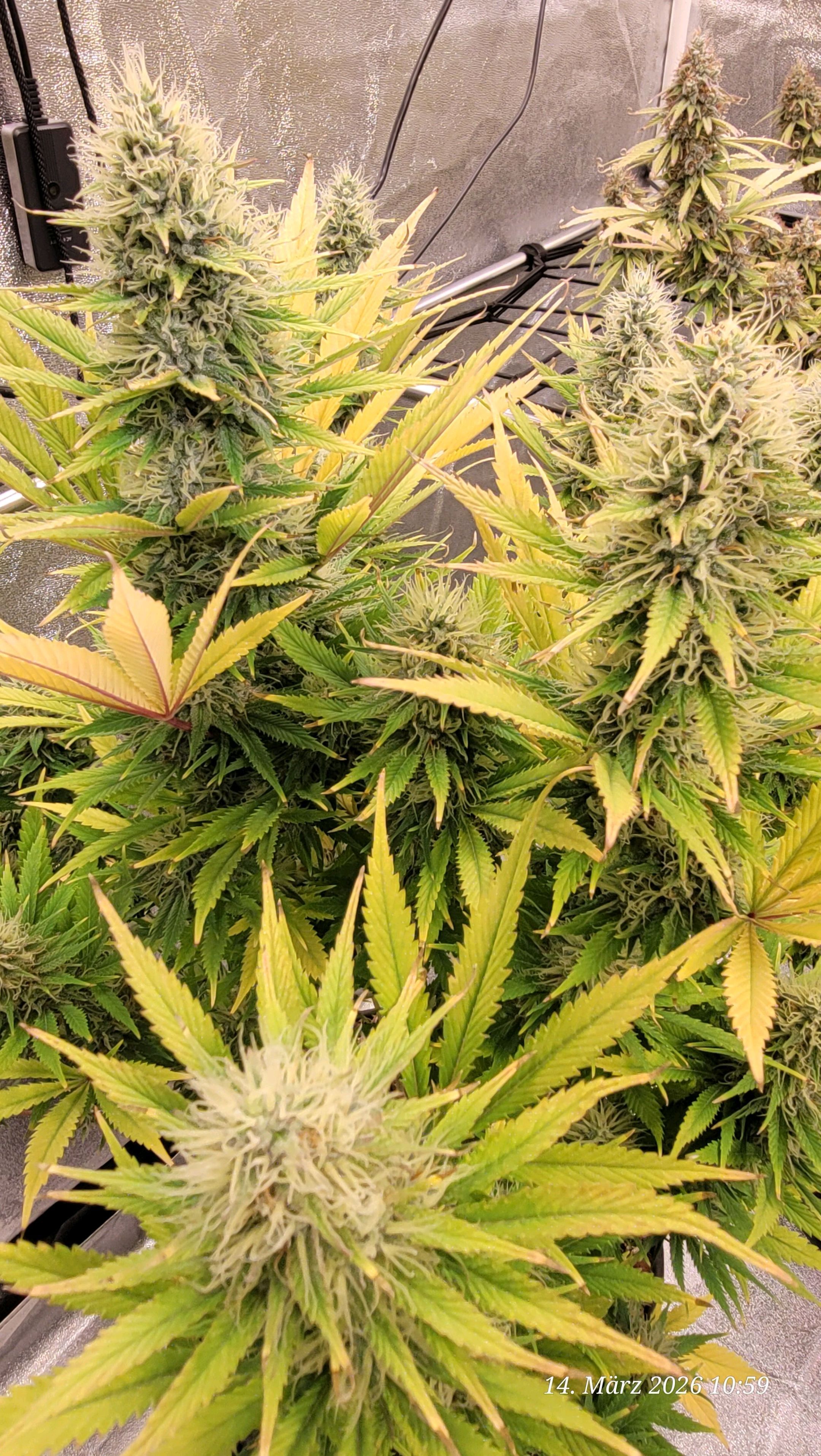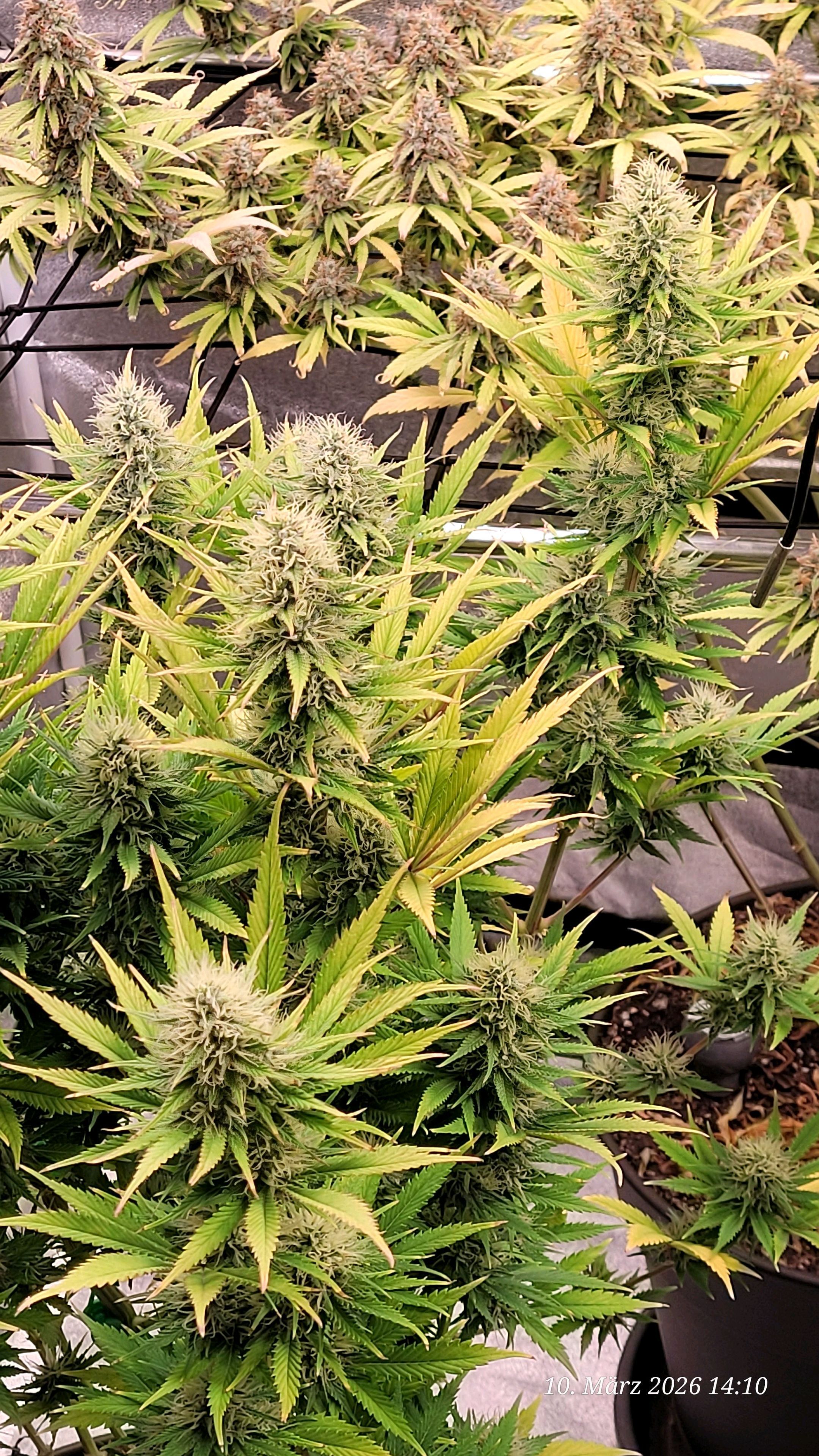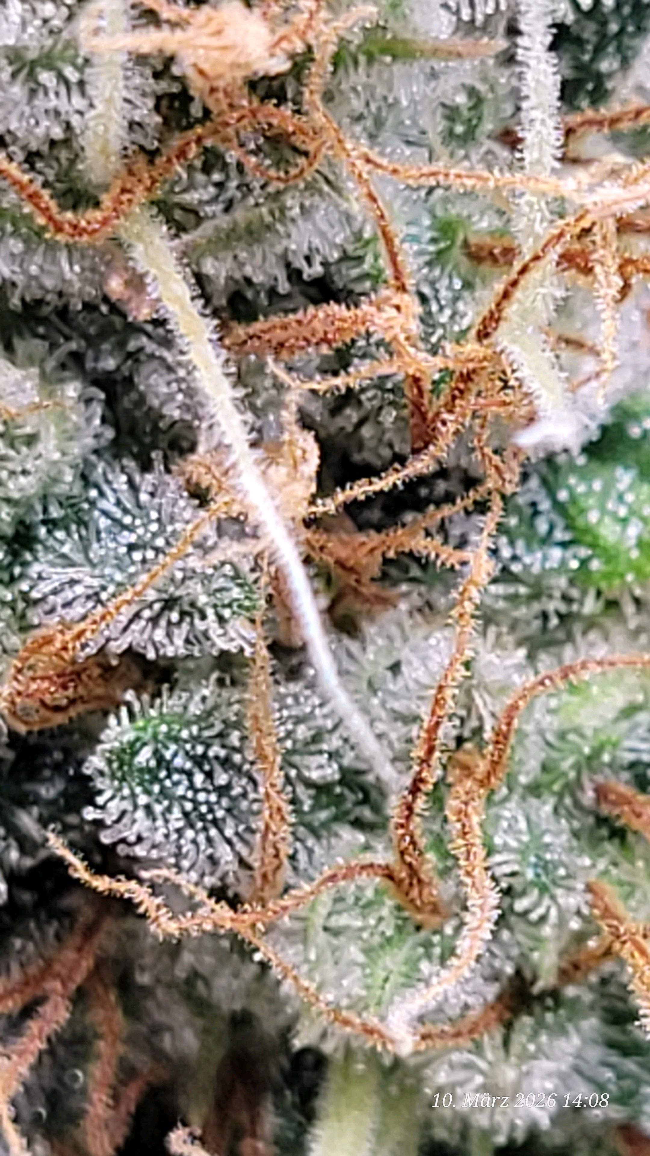 These will once again be very dense, firm buds and guaranteed with a well-rounded aroma. In about 20 days, the two will be ready. Given 60 - 65 flowering days, I will reach the end around 63 to 68 days. A few more days that will show what else is coming. The Jamaican needs a few more days. It is also noted as Sativa dominant, but with a relatively short flowering time. But its journey is already going into 9 - 11 flowering weeks. And only now are the first 2 pistils beginning to turn orange/brown on her. All others are still light! Apart from her light stress, which I have now somewhat corrected, and the associated nutrient shift / magnesium deficiency, she is still developing well. The ‘pompoms’ (buds) are continuously increasing in size.