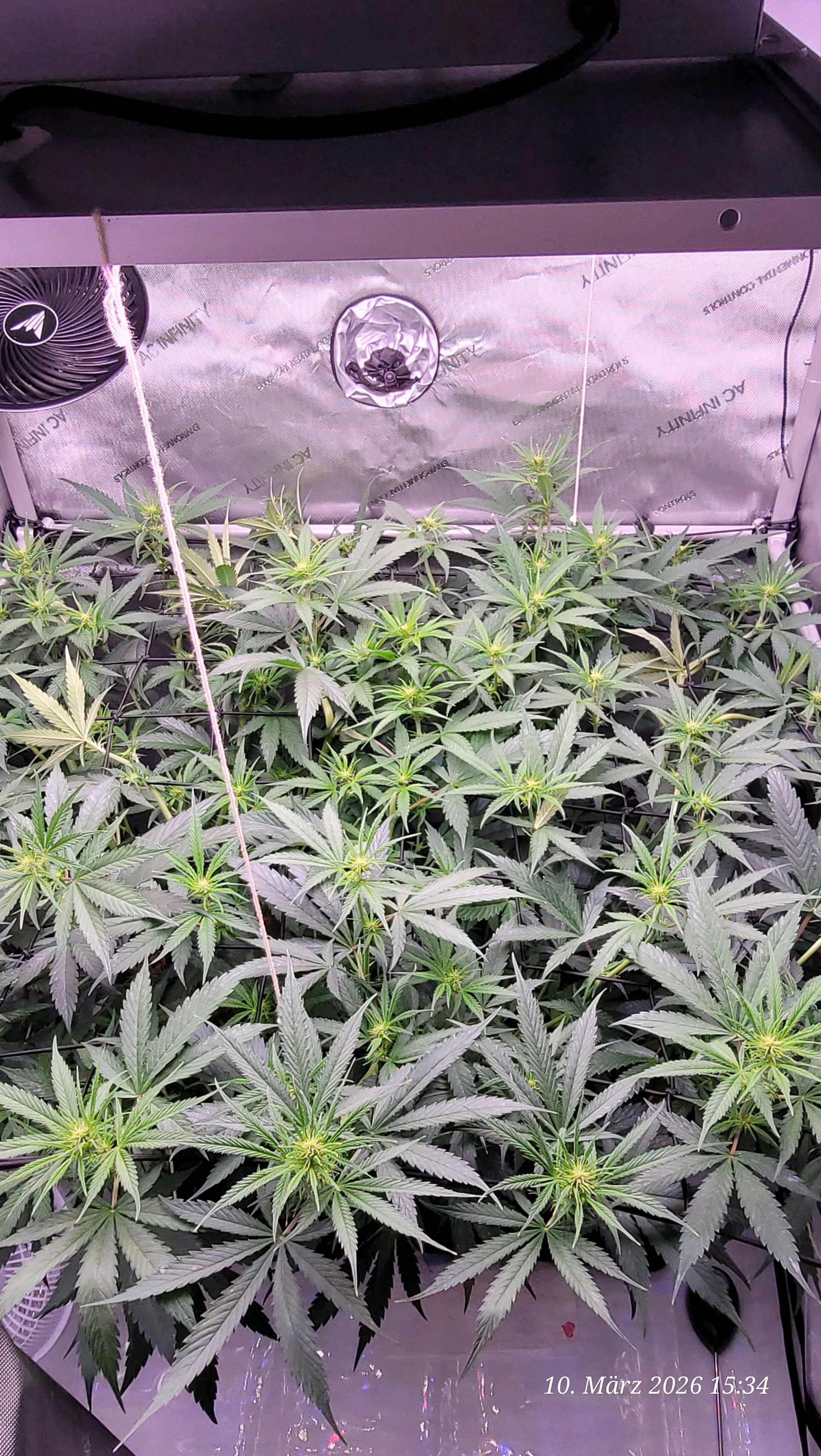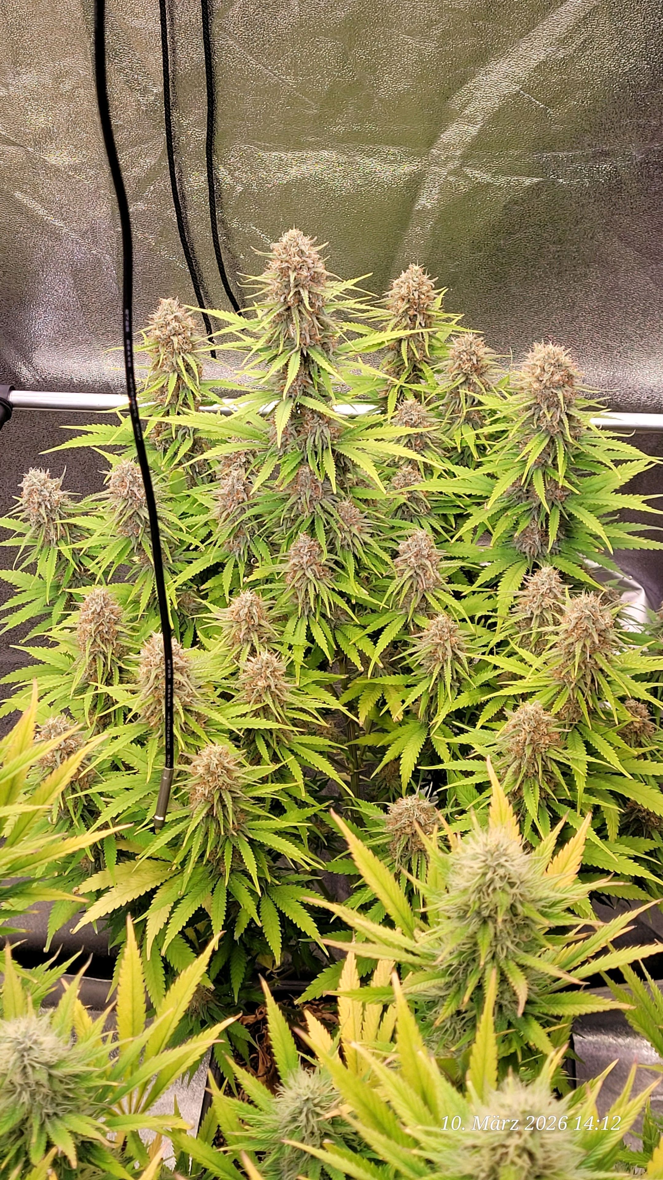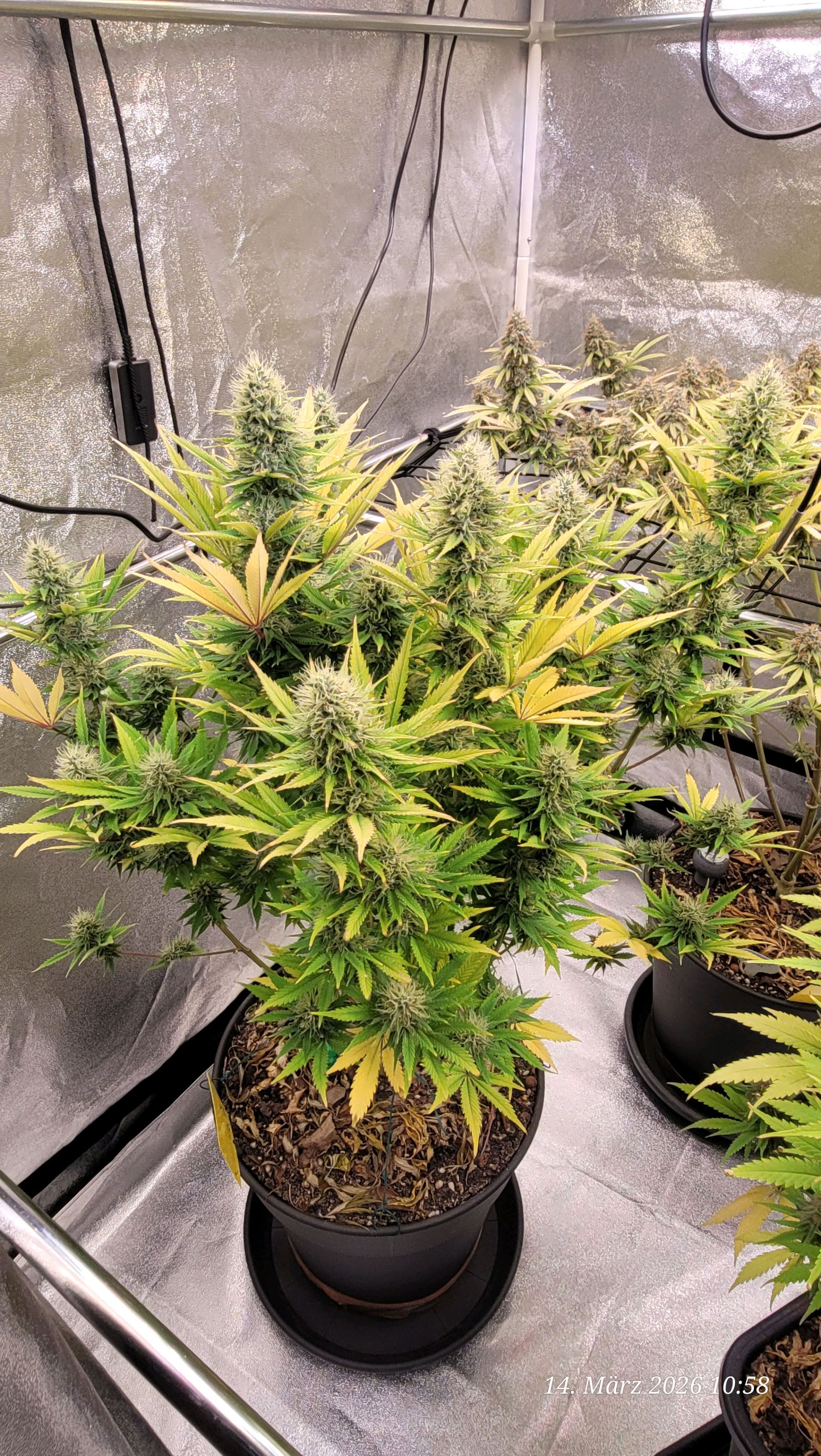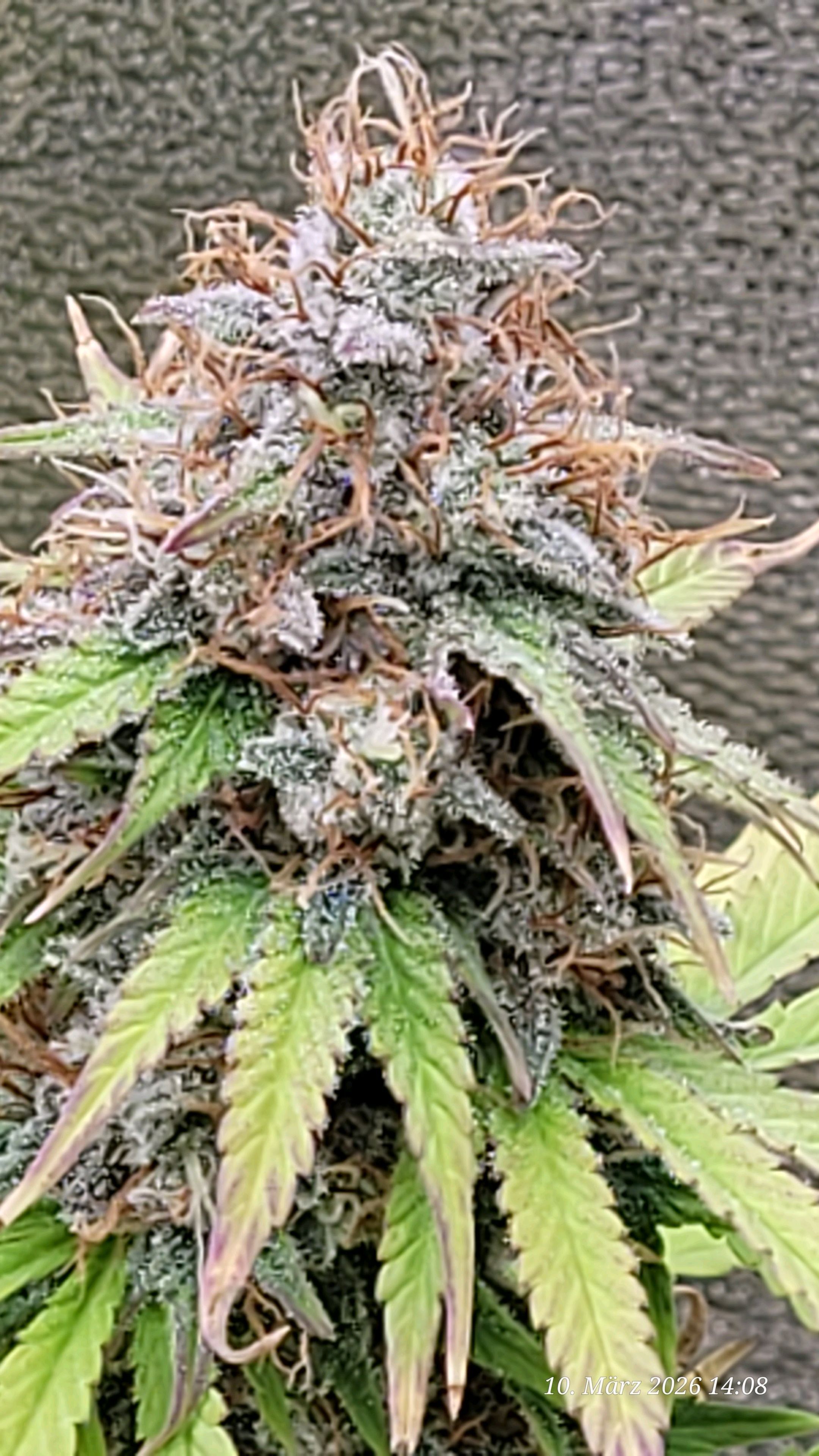 These will once again be very dense, firm buds and guaranteed with a well-rounded aroma. In about 20 days, the two will be ready. Given 60 - 65 flowering days, I will reach the end around 63 to 68 days. A few more days that will show what else is coming. The Jamaican needs a few more days. It is also noted as Sativa dominant, but with a relatively short flowering time. But its journey is already going into 9 - 11 flowering weeks. And only now are the first 2 pistils beginning to turn orange/brown on her. All others are still light! Apart from her light stress, which I have now somewhat corrected, and the associated nutrient shift / magnesium deficiency, she is still developing well. The ‘pompoms’ (buds) are continuously increasing in size.