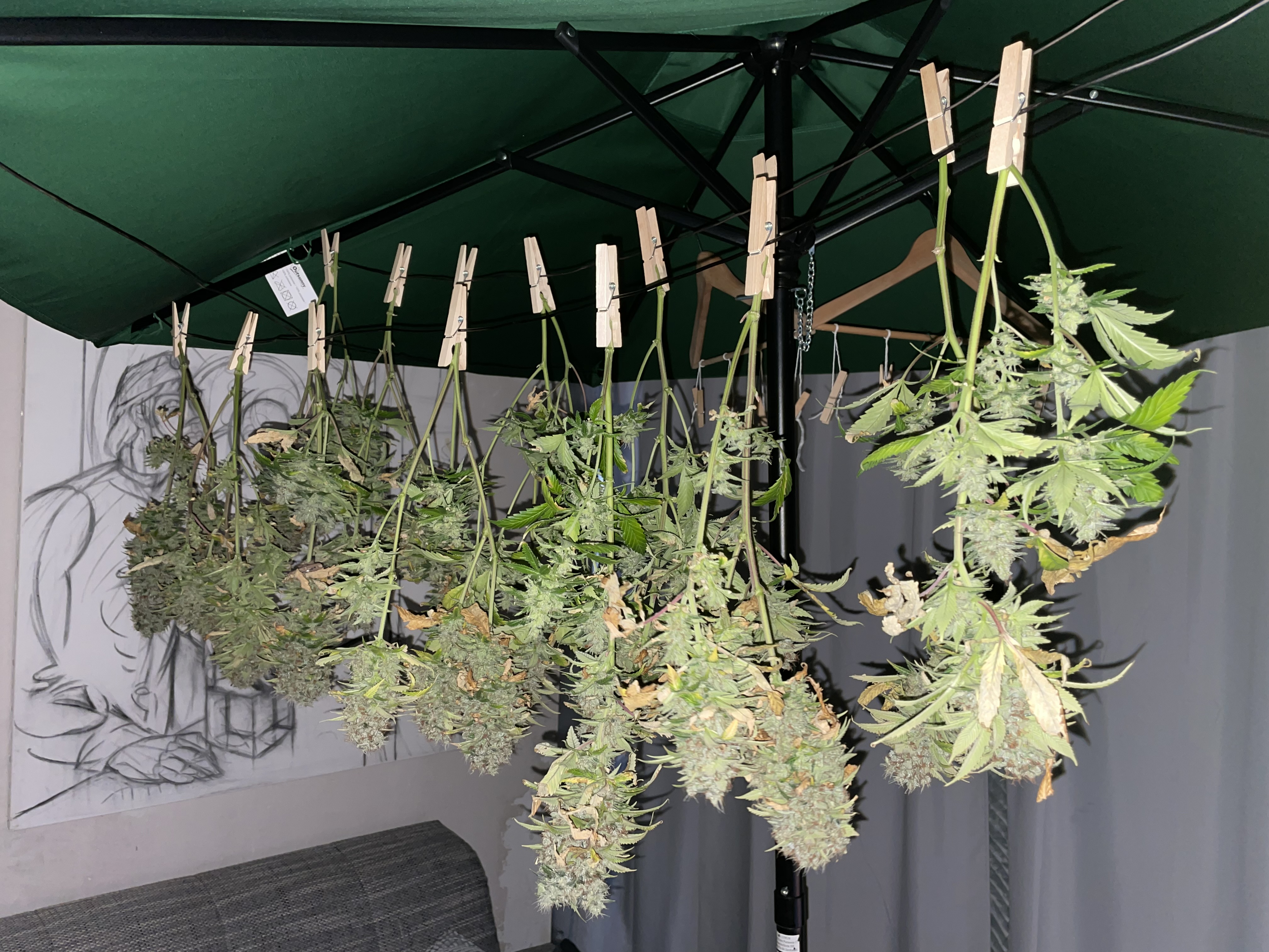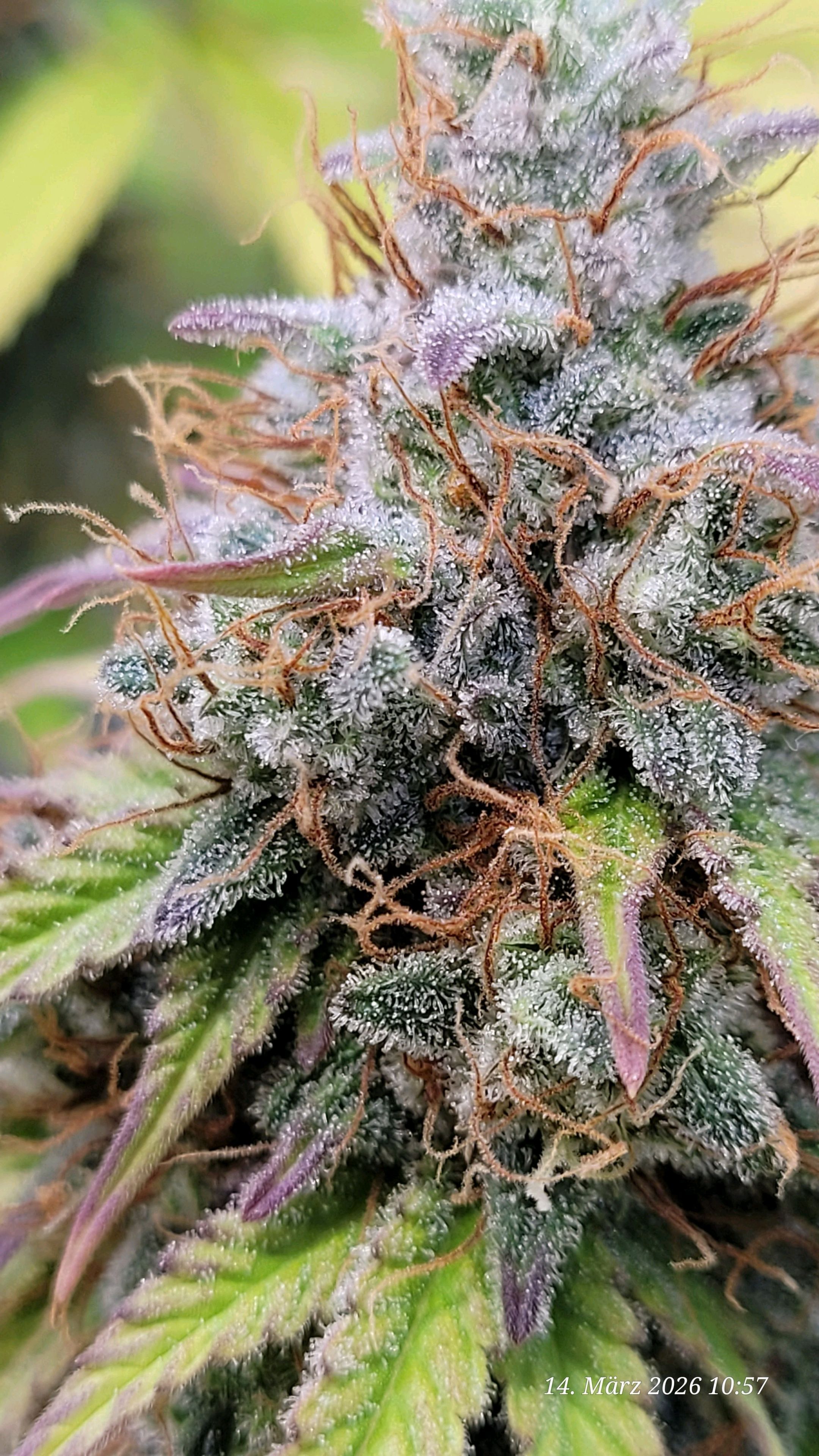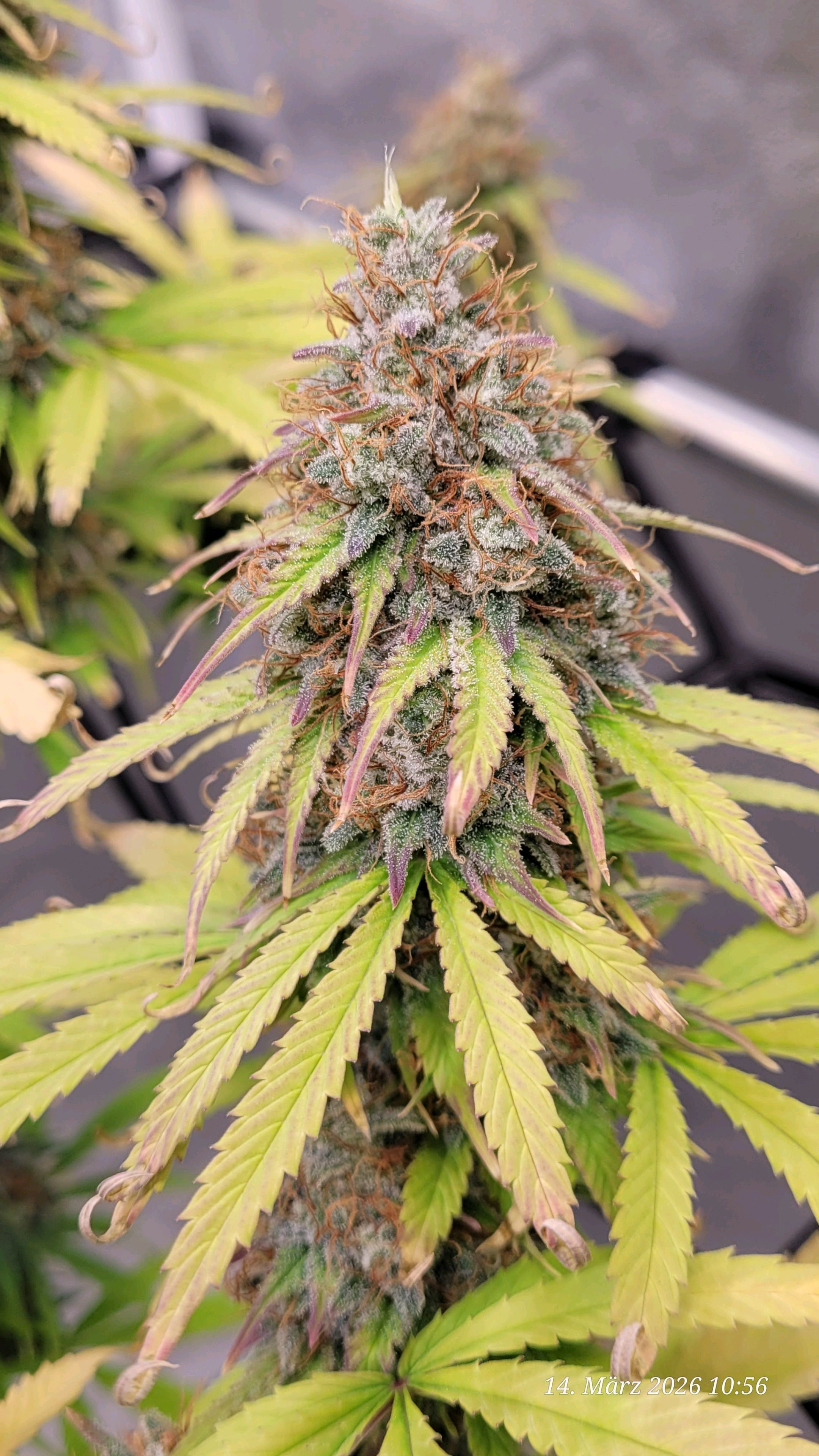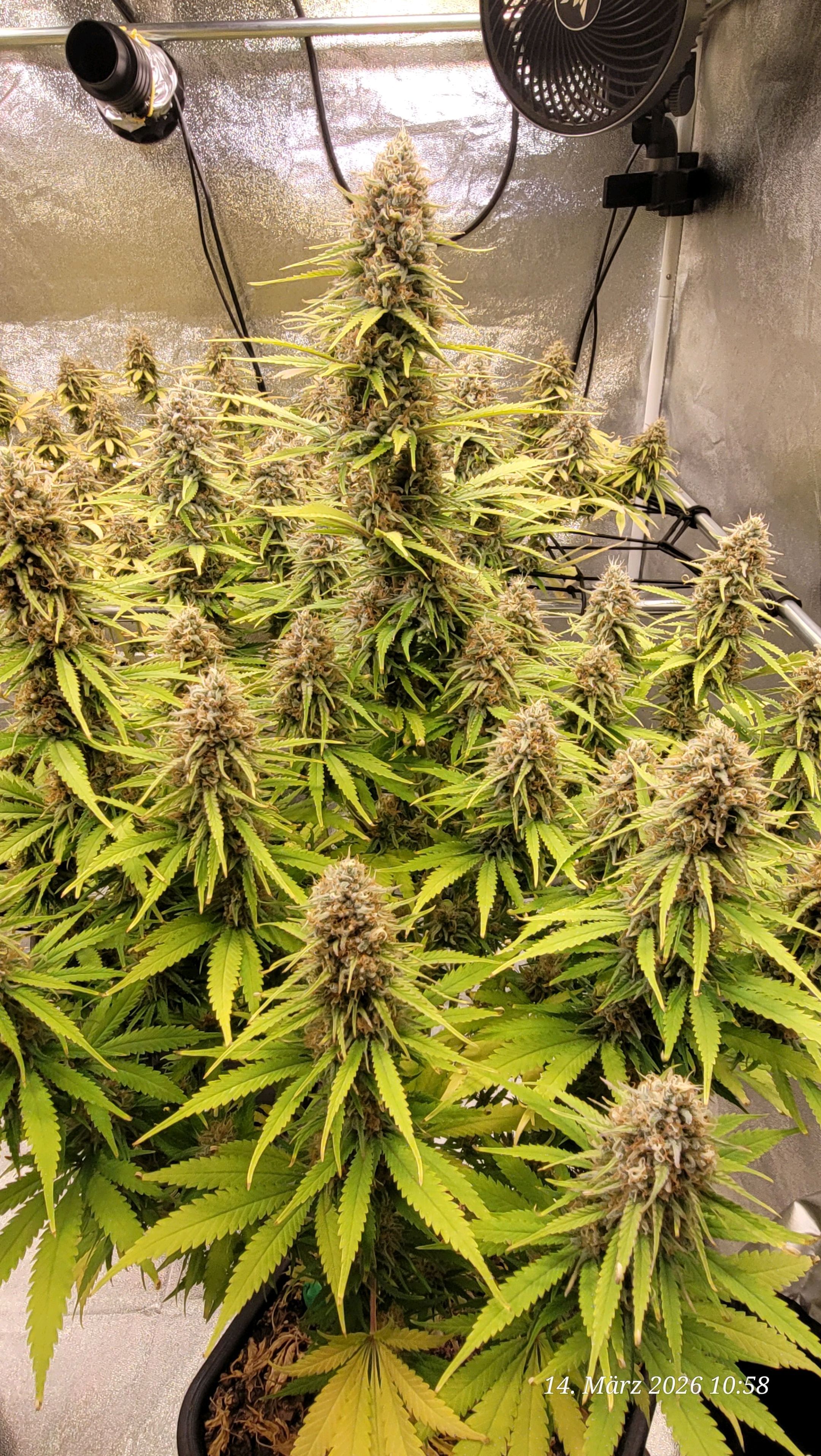 Now, for my Cookies OG and Strawberry, it’s definitely the last three weeks. I’m curious to see what the buds will gain and how resinous they will become. The aroma is now steadily increasing. I probably don’t have to worry about bud rot this time. The daytime temperature no longer goes above 26 degrees, and the RH is now set to 43 - 45%, and at night, to get a little purple here and there, I keep the temperature at 18 - 19 degrees. Today I also started a compost tea again with leaves and small animal bedding, among other things, which will find its final rest as fresh mulch for the clones. With the Cookies OG, I removed dead leaves again today and those that were no longer firmly attached. The fact that it looks so ‘exhausted’ (sucked out) is also largely due to genetics; Girl Scout Cookies is well-known for a strong fade towards the end. But the buds are getting crazier and crazier. I took some more pictures today. RRRRRR how frosty, sticky, and amazing the aroma will be. To begin with, the three are on day 96 today and flowering day 46, and it’s slowly heading towards the end of the 7th flowering week. It’s now entering the final phase where the buds thicken and a rich amount of resin is formed again.