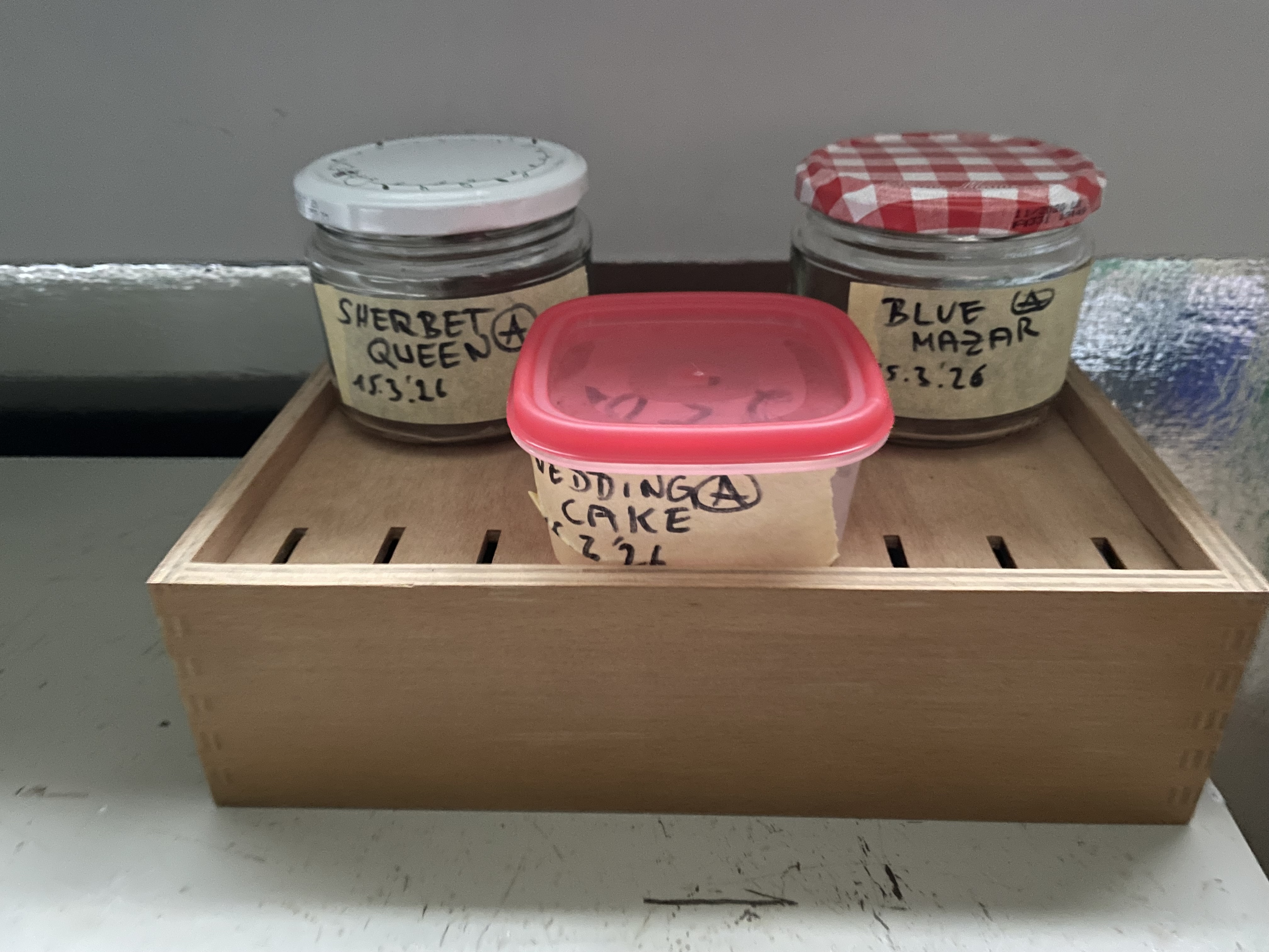 The lamp above the Jamaican on the left and the Cookies OG on the left side were dimmed down to 75%. On the right, the Strawberry is just barely keeping up with photosynthesis, so I stayed at 80%. I distributed 1 gram of Magnesium Sulphate and some sulfur to each of the three pots, which the soil organisms also really like. But for watering today, the soil was still moist enough for me, so today I only watered with 500 ml each from below into the trays, and in each, 0.5 gr of Magnesium Sulphate was dissolved in the water so that the ladies could absorb it directly today. Additionally, I’m now only giving smaller amounts of water to keep the sensors around 50 - 60% because consistent soil moisture is even better for the soil bacteria than constantly adding water and then letting it dry out.