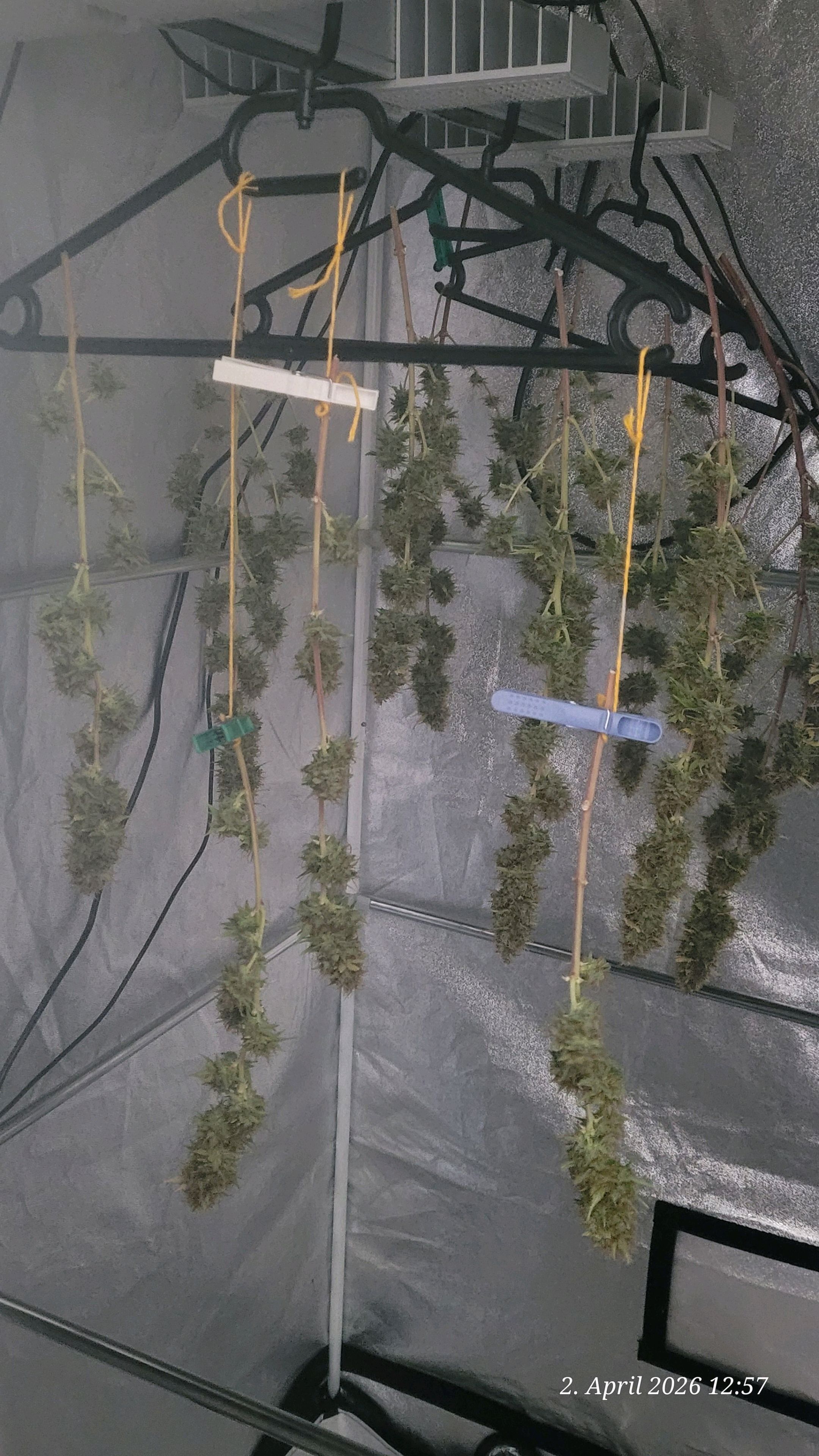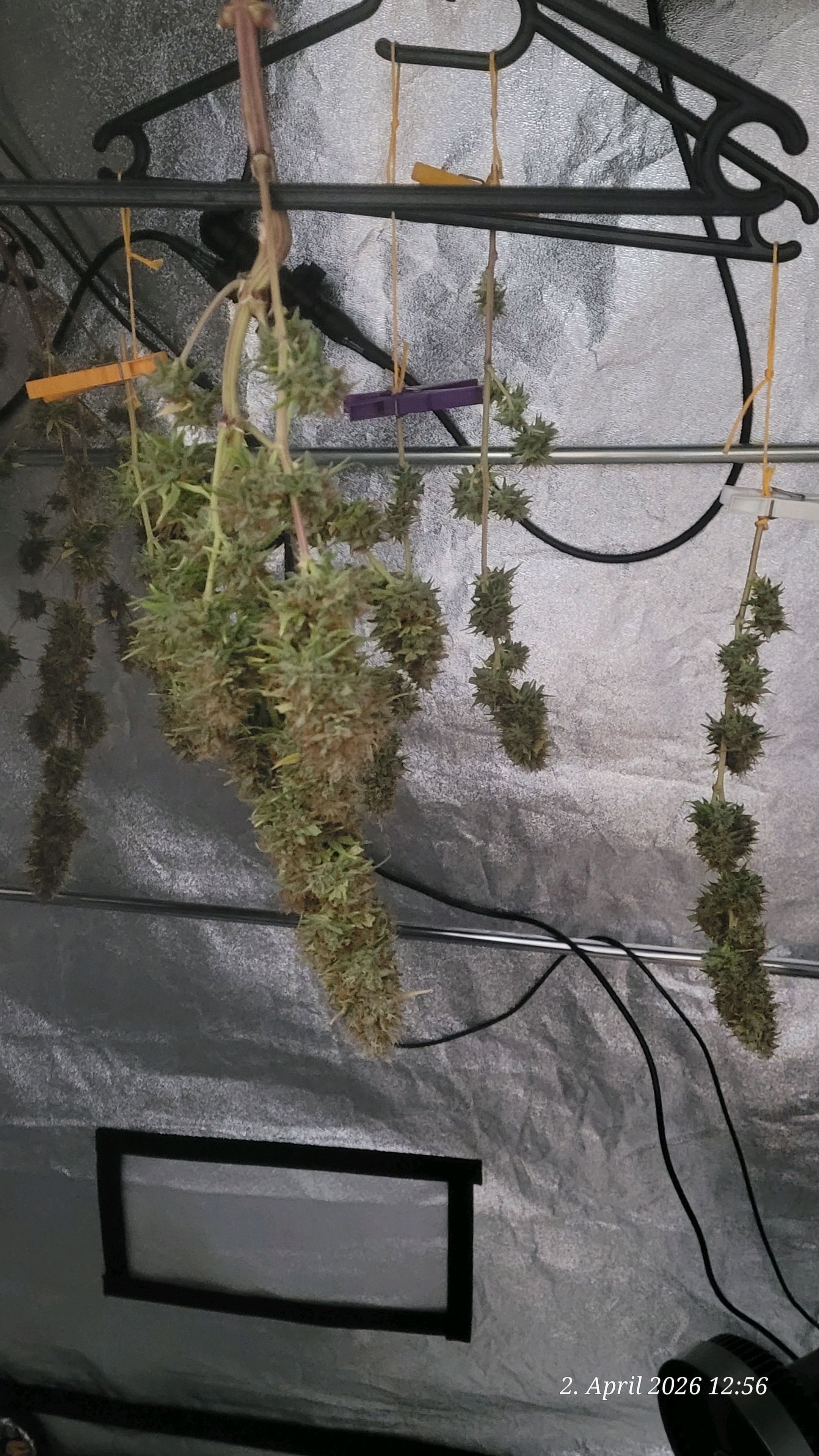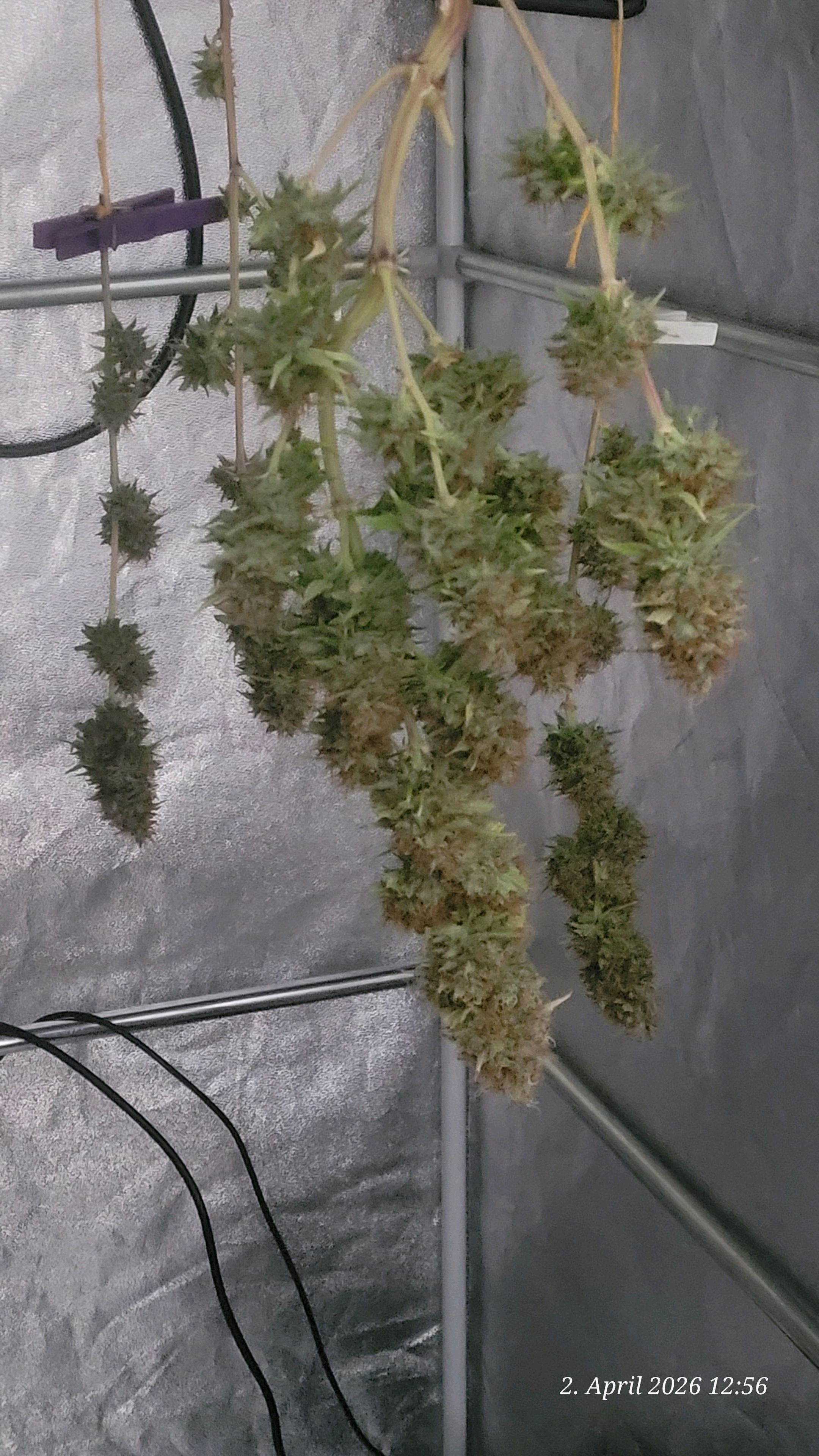 Defoliated and with a narrow wet trim, the good one is drying in the tent. Day 1 of drying, the temperature remains smoothly below 20 degrees. Exactly at 19.4 degrees.