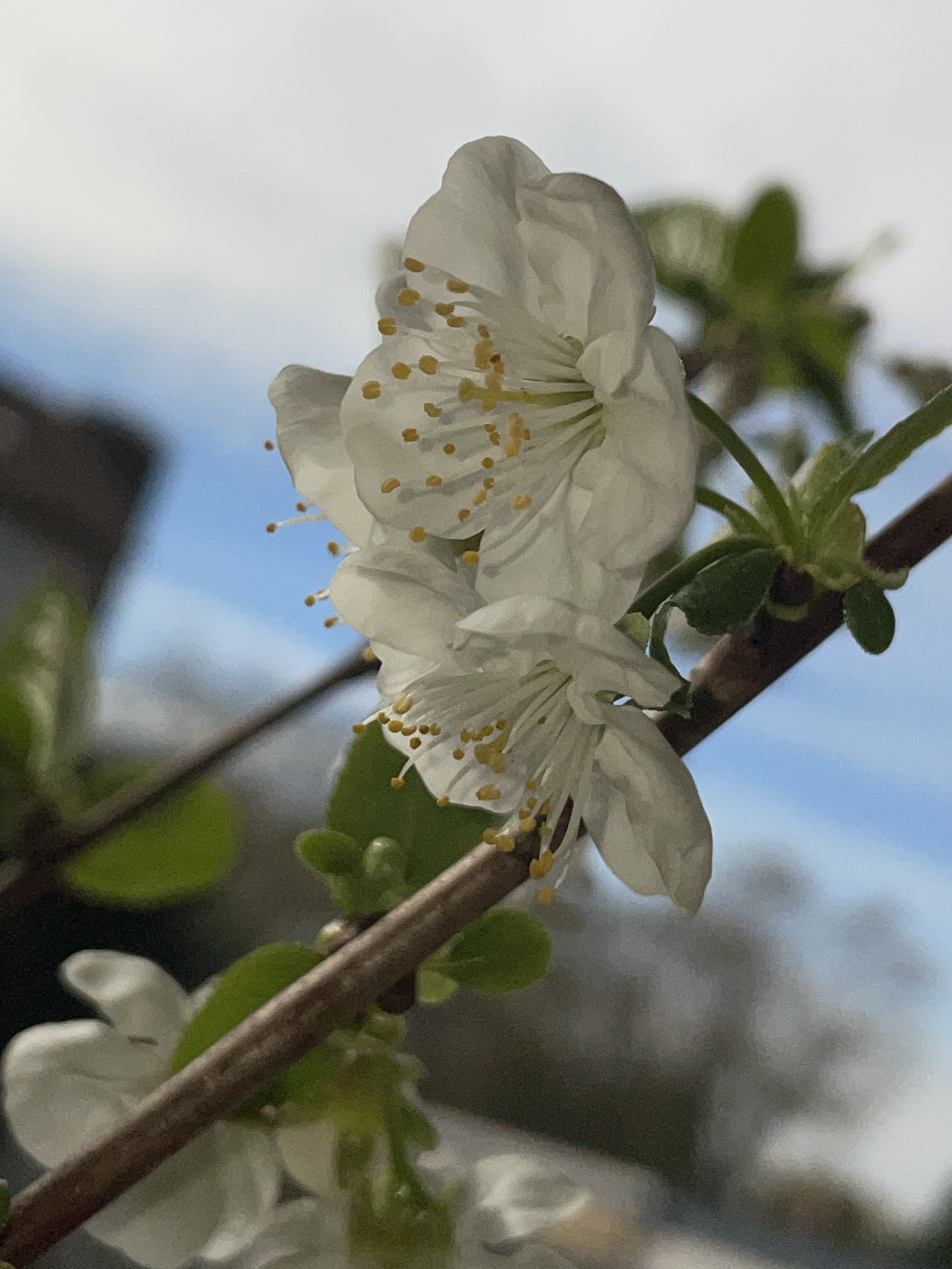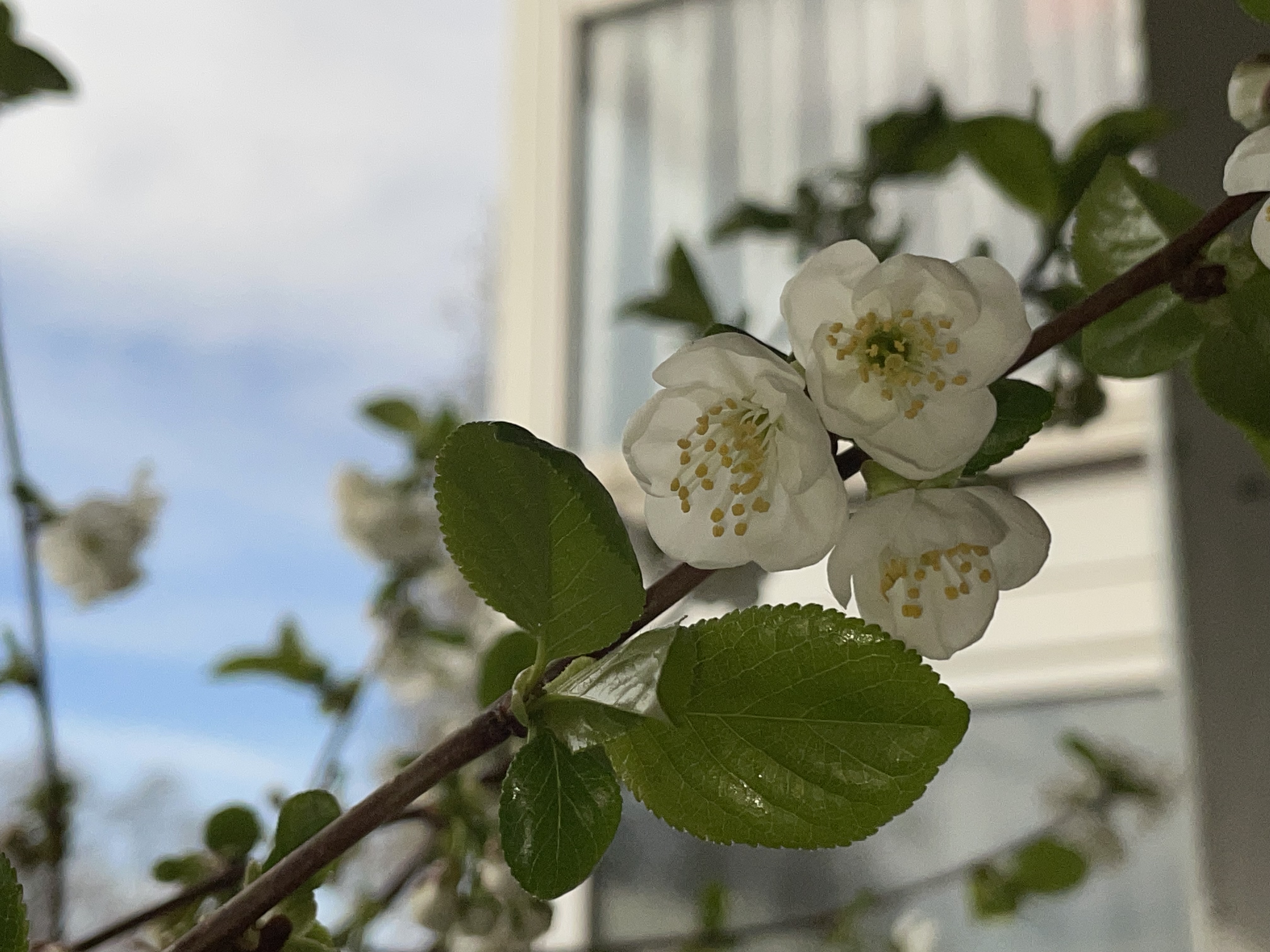 The cherry tree in the large pot is blooming for the first time.