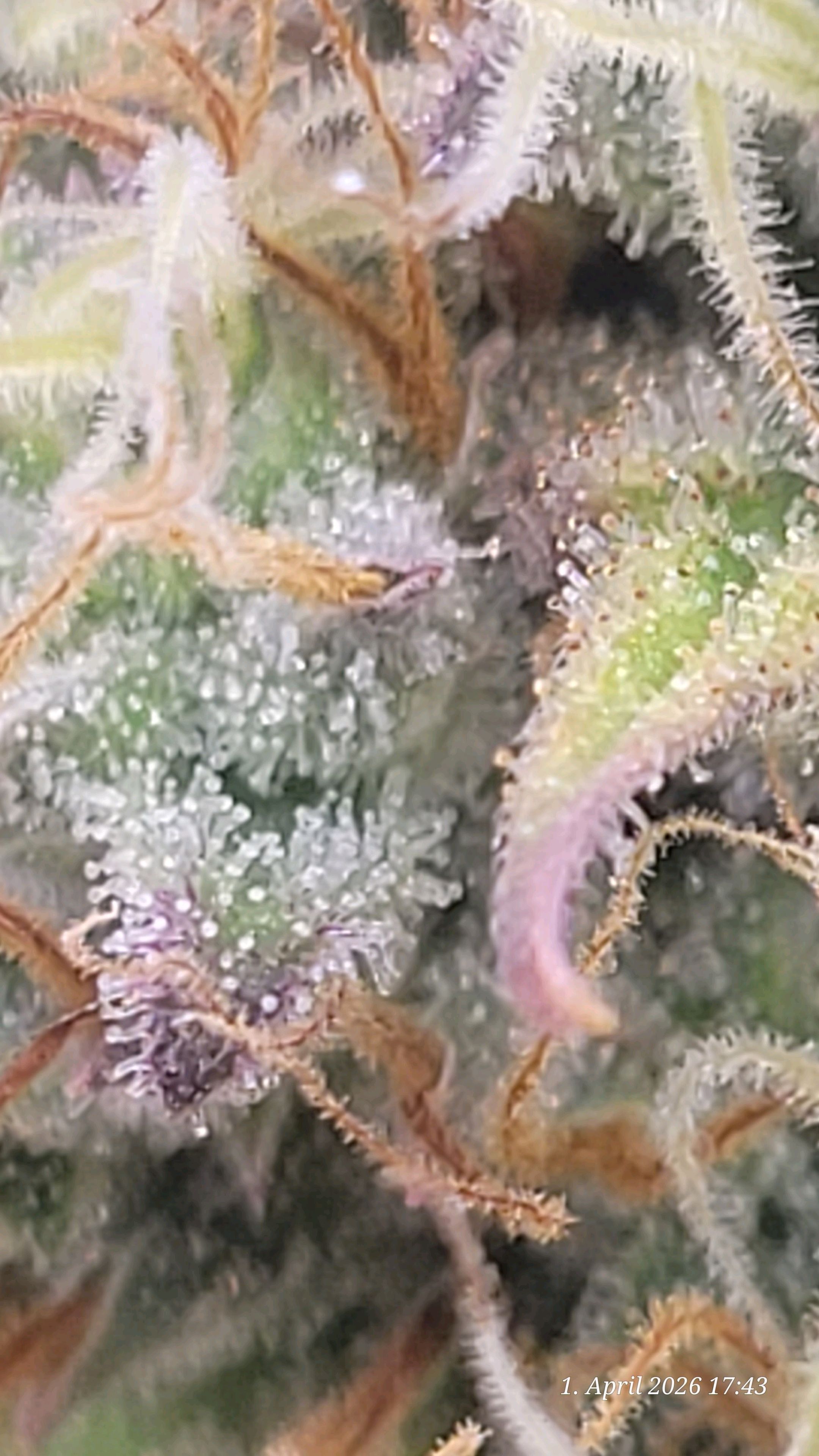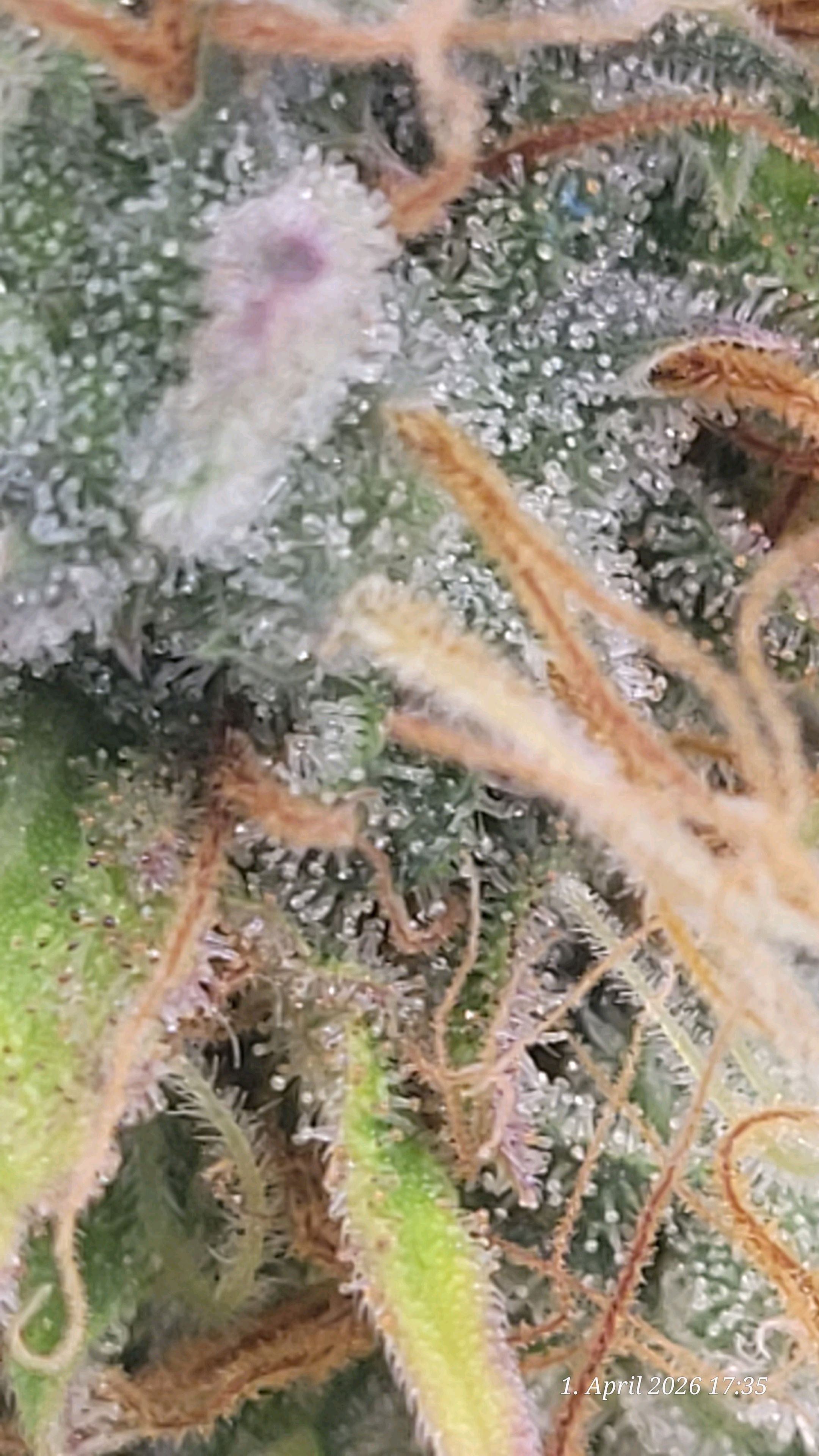 Since I want the more invigorating, uplifting Sativa effect here, with 5 to 10% amber on the sugar leaves, this explains why the light is off and the plant is resting peacefully.