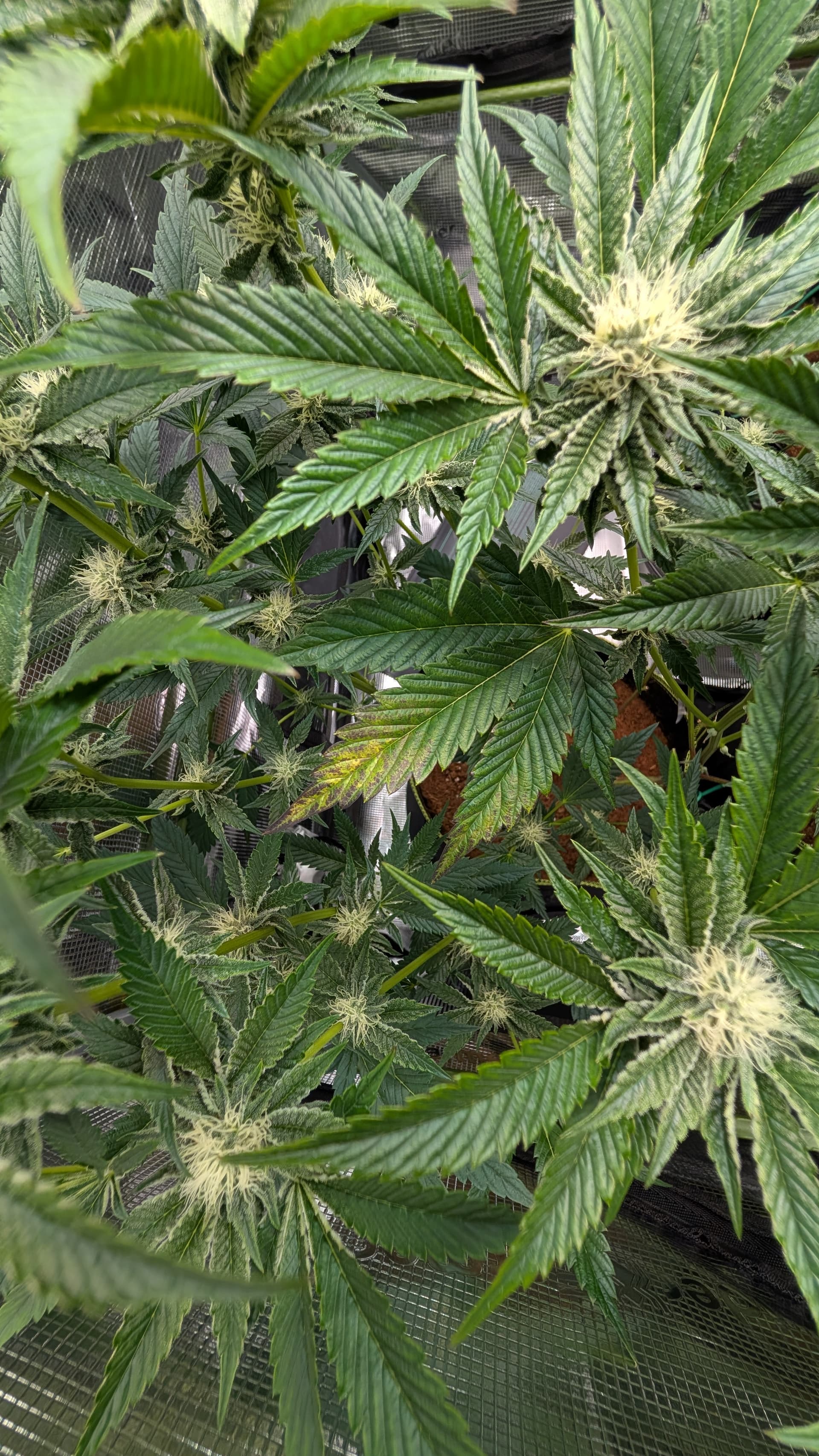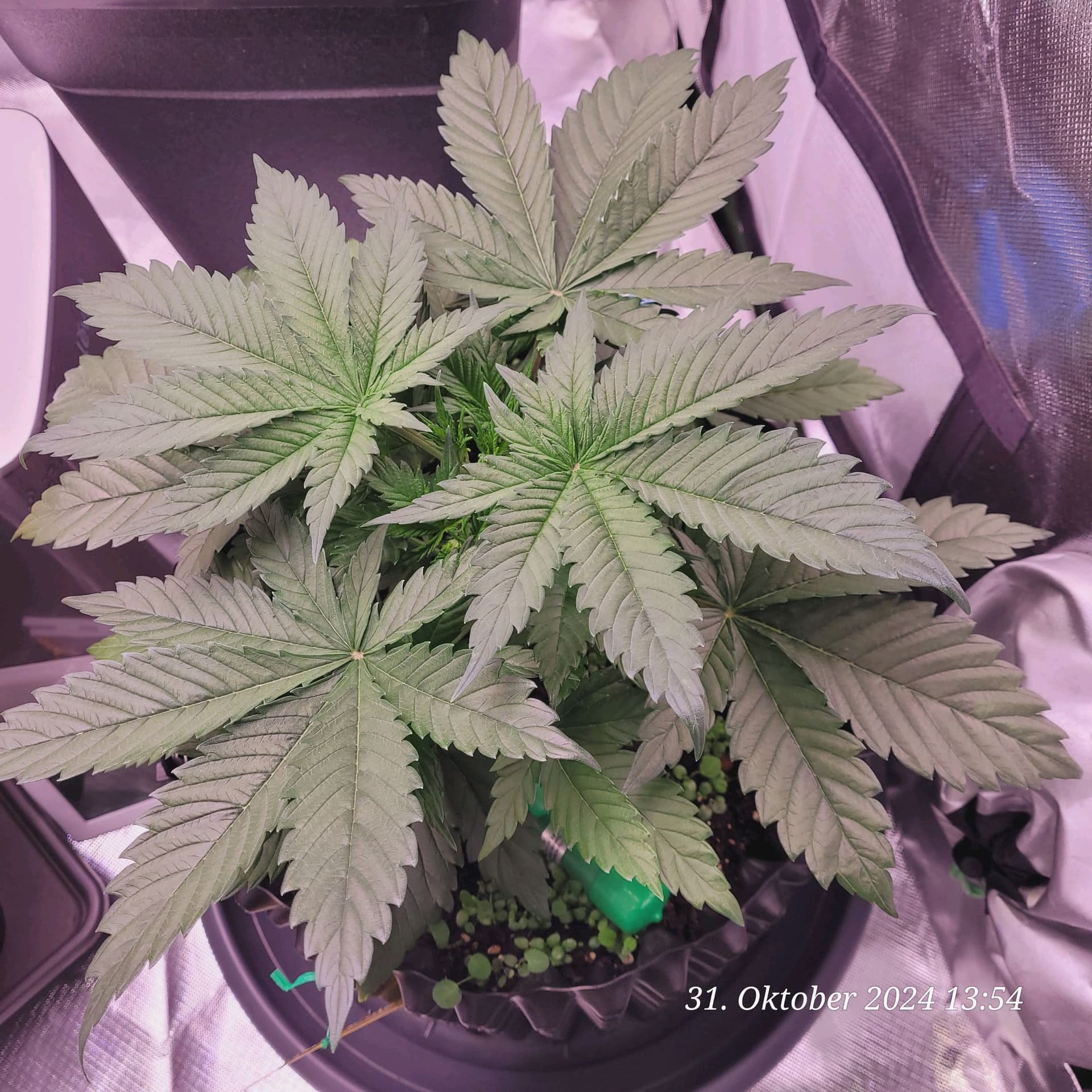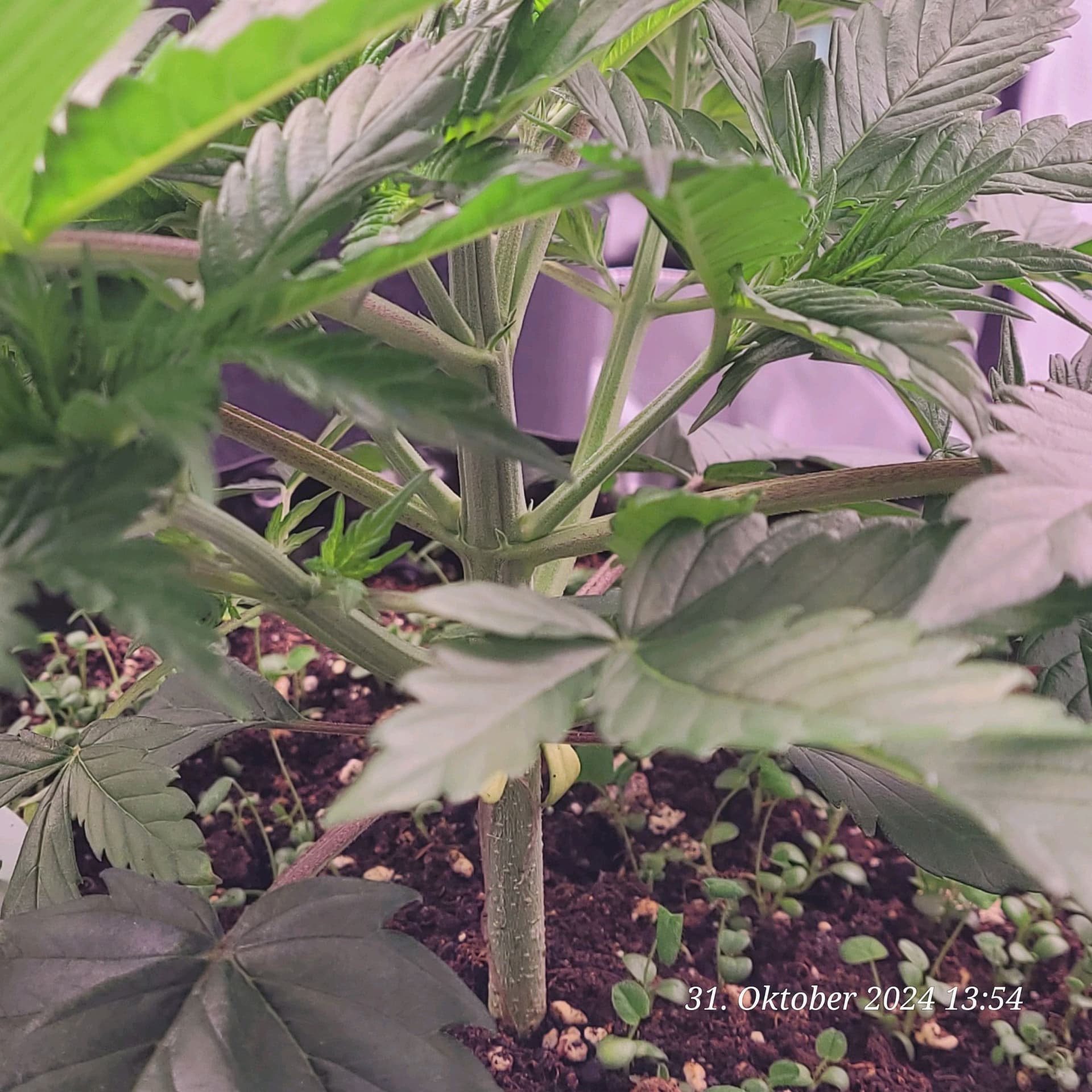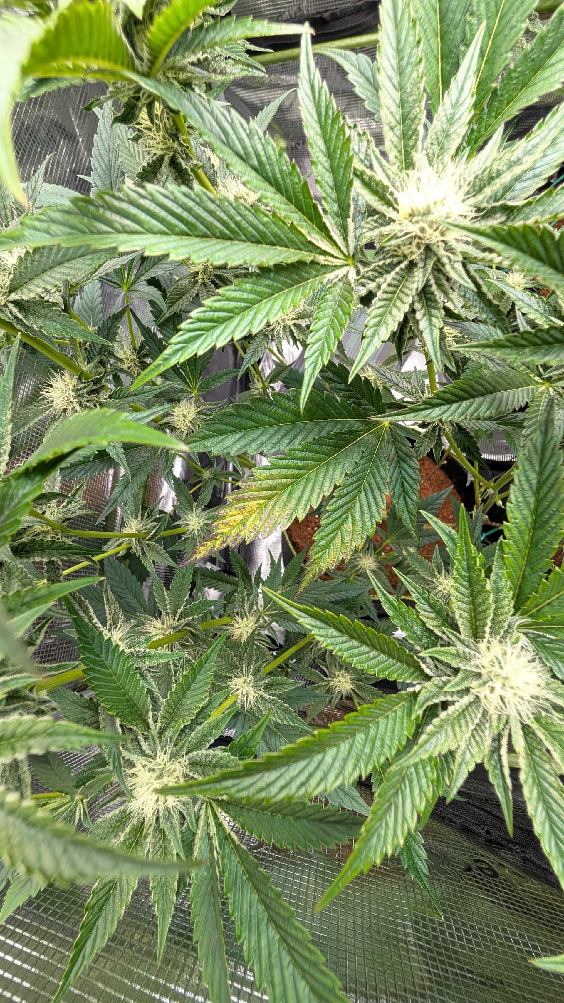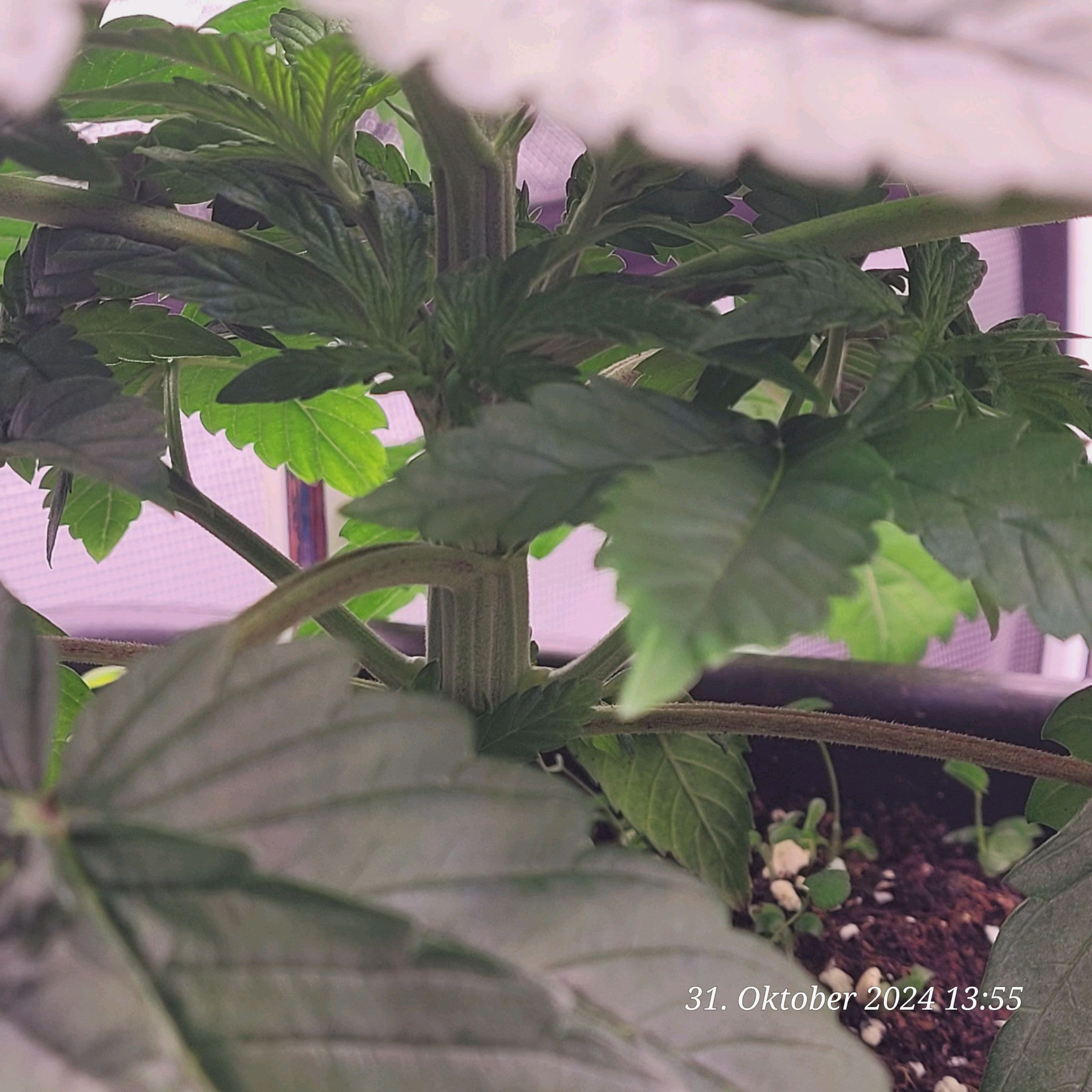 Denke nur , das ich immer noch die Erde zu stark an gemischt habe weil manche Blätter sehr Stickstoff satt aus sehen . Den Dimmer hab ich noch mal auf 50 % runter gemacht von 60 % weil die Nodien sehr Dicht an einander liegen , aber fette Ästchen die sich da bilden .