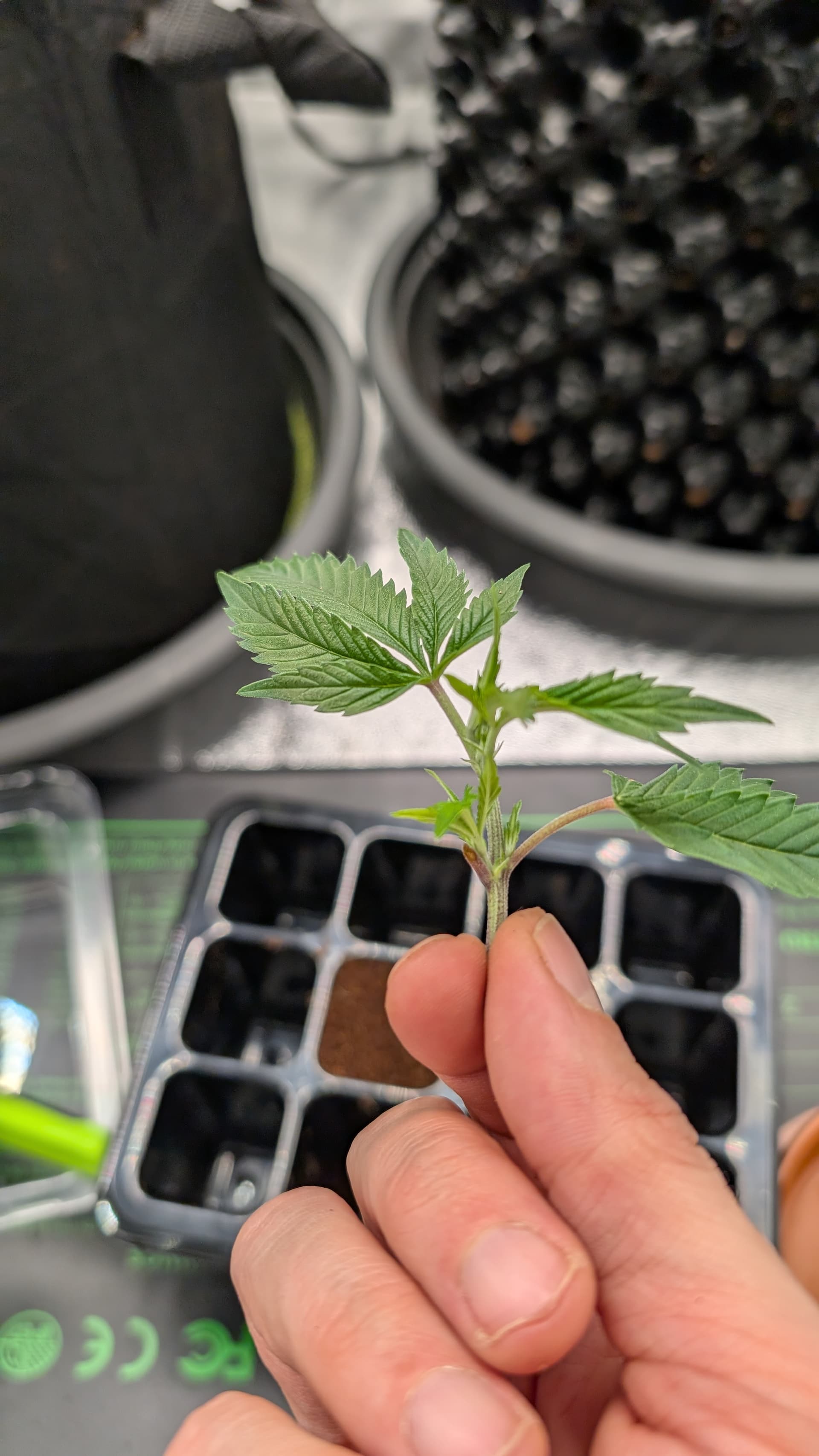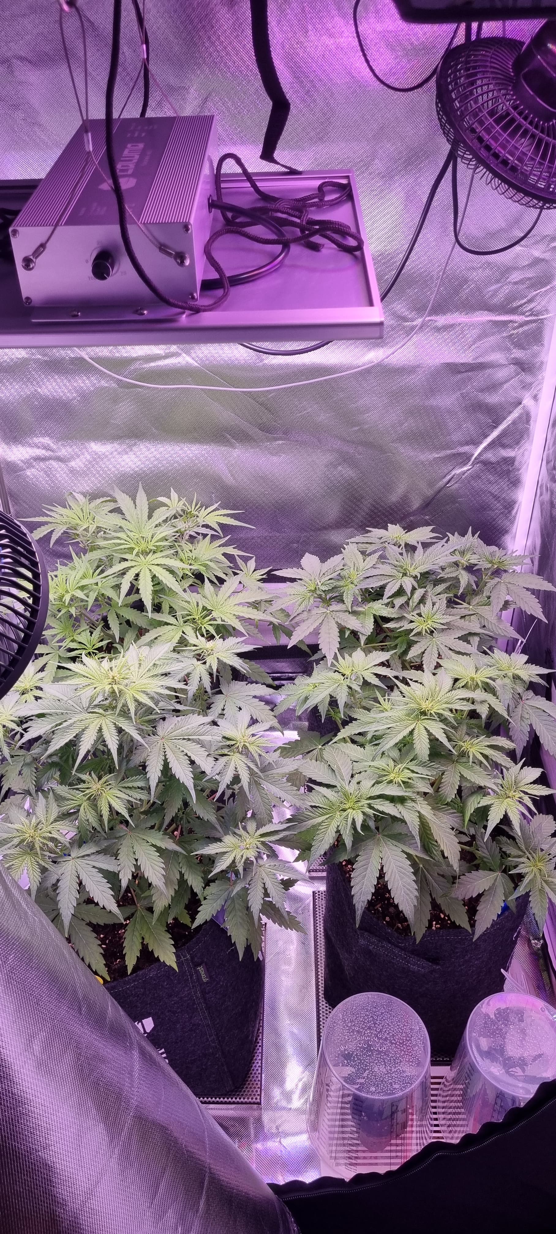 Also genug Feuchte im Substrat noch vorhanden . Derzeit Gießen ist so einmal in der Woche . Damit die Erde immer wieder gut runter Trocknen kann und die Wurzeln auf Suche gehen müssen . 4 Tage ist es nun her, wo alle 4 getoppt wurden und überall unter den Riesen Blätter stehen die Triebe . Und nach oben gehen nun 2 Spitzen .