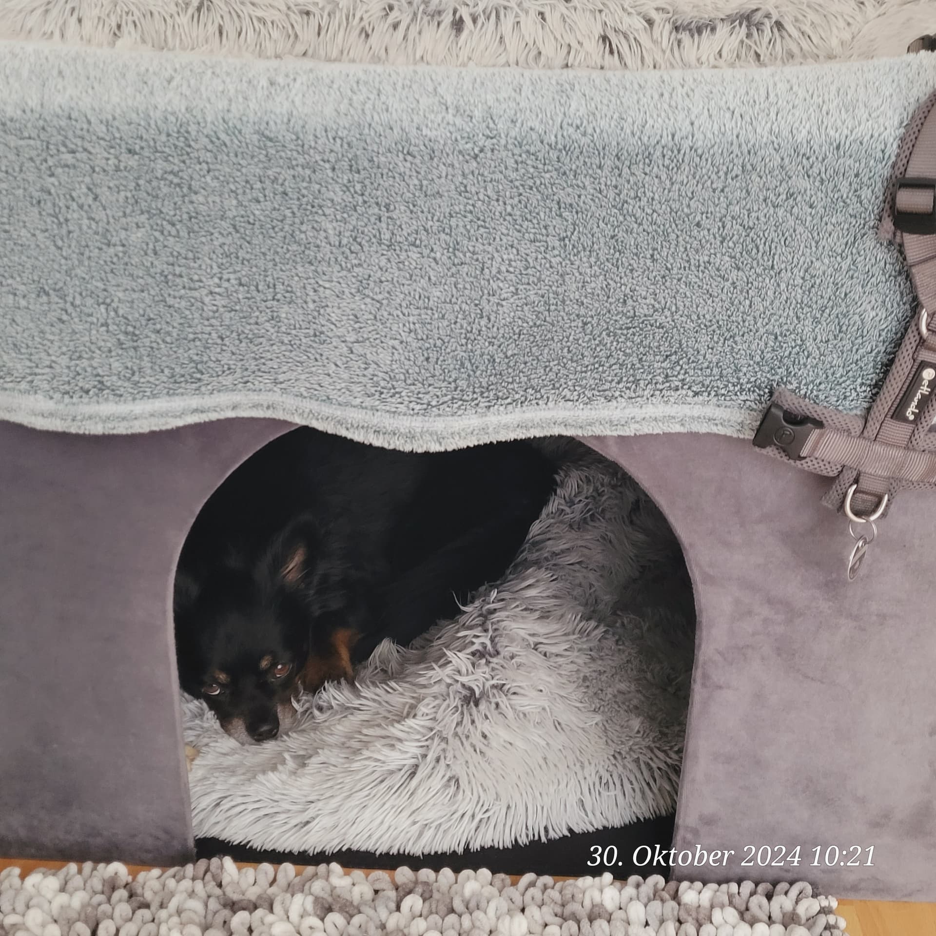 Kaum die Schuhe , die Leine und Geschirr in der Hand , flüchtet der Gute in sein Reich und guggt mich blöd an .