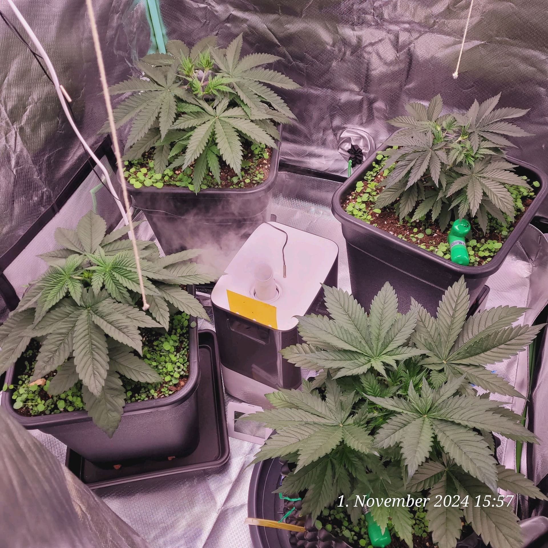 Daher bleibt es da heute zu , keine neuen Bilder , da ich das Klima dort herrschend nicht kippen möchte durch öffnen . Morgen oder Über Morgen wird dann voraus sichtlich da die letzte Wässerung statt finden . Danach lasse ich die Verdursten . Heute Blüte Tag 56 , über Morgen dann noch mal einen ganz dicken Schluck bei Tag 58 und dann 5 Tage trocknen lassen die Erde . Dann sind die an Tag 63 fertig zur Ernte und haben die 9 Wochen Blüte voll . So weit dazu die Planung , werde aber noch mal die Trichome näher betrachten , irgend wo in der Zeit . Zerren sich aber nun schon schön auf , schön Herbstlich , stark riechend und klebrig das ganze .